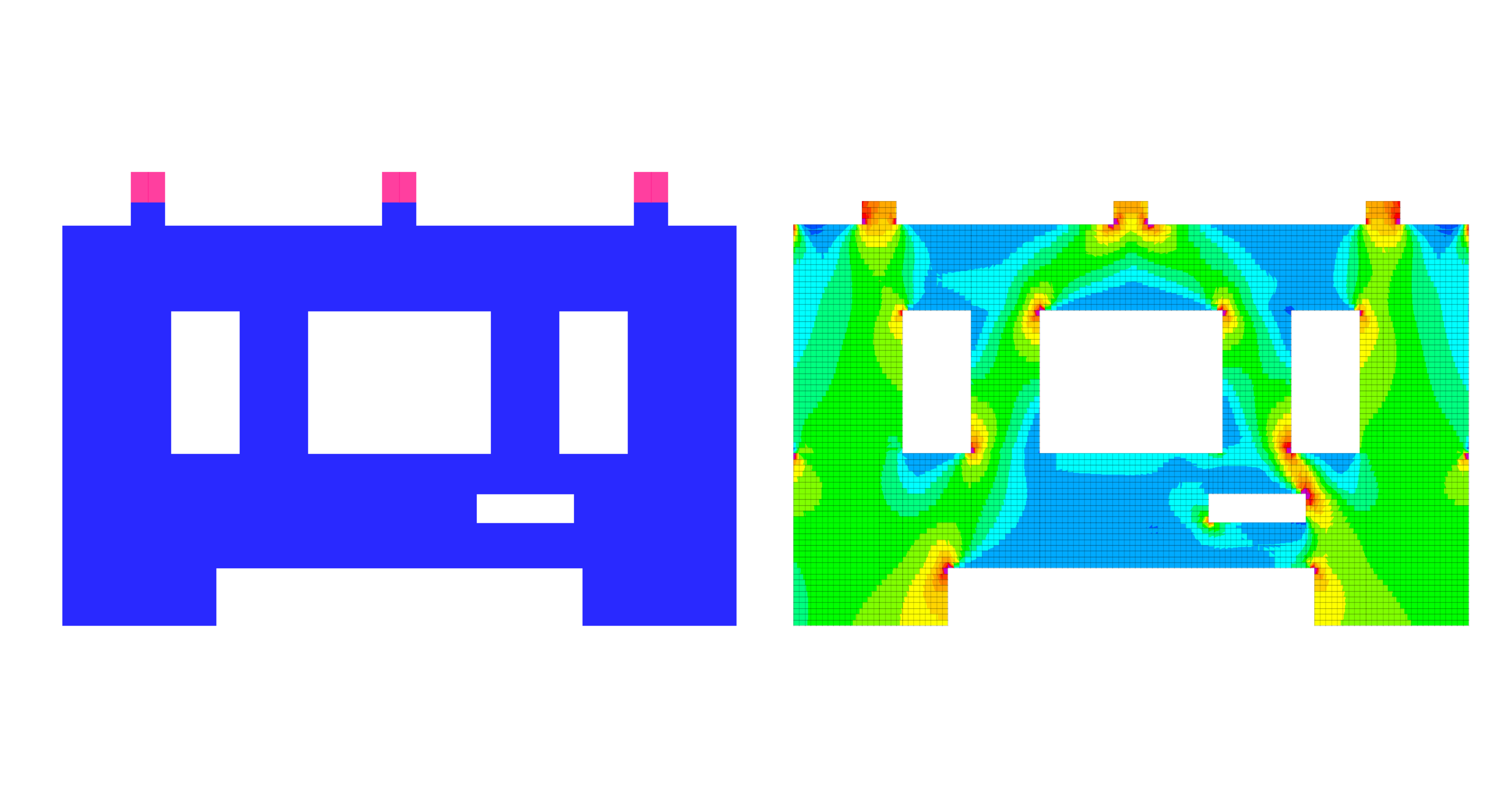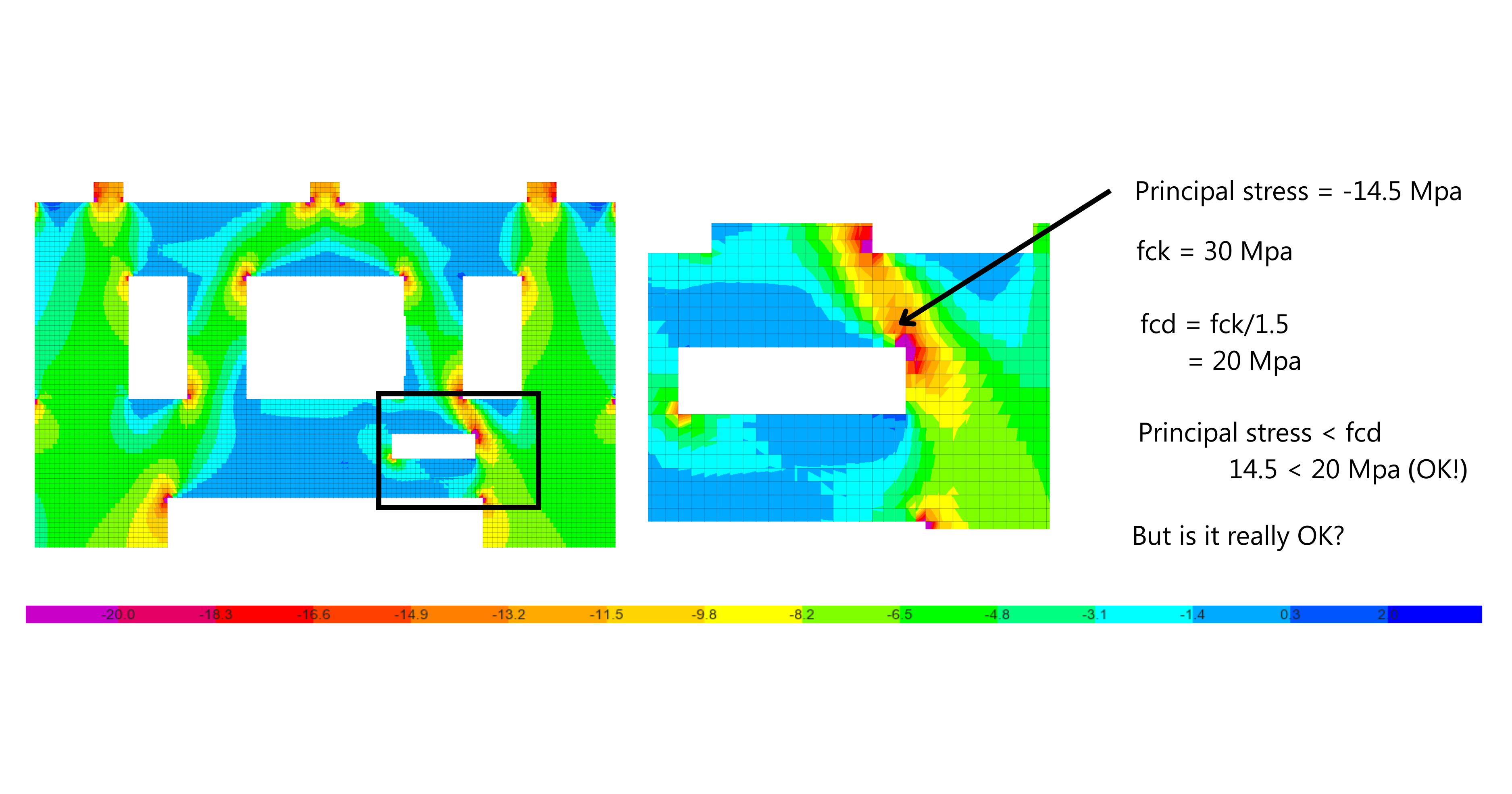 In the wall shown above, engineers have two options for designing the wall. One is to use strut-and-tie, although this a good and suitable method, there is a lot of manual work and trial-error involved, which might be time consuming. Second is to use approximation in global FEA software by evaluating principal tensile stresses to determine reinforcement requirements and verifying that principal compressive stresses remain below the concrete’s design strength.
