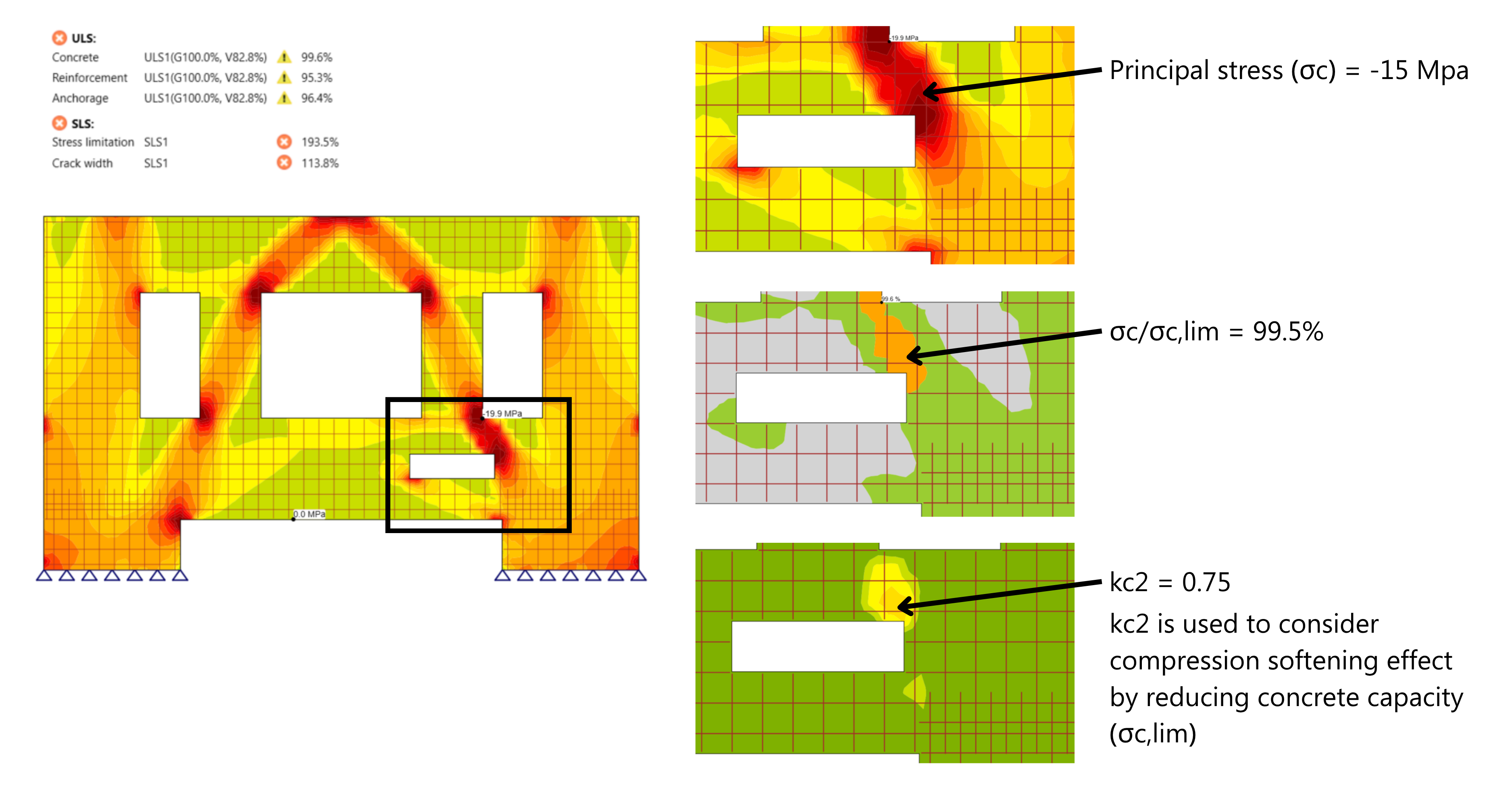 This ULS failure is exactly caused by the consideration of the compression softening effect by the kc2 factor which reduces the concrete capacity by a factor of 0.75. Hence the concrete capacity is now, σc,lim = fcd x k2 = 20 x 0.75 = 15 Mpa. That's why with 15 Mpa of compressive stress, the utilization (σc/σc,lim) is shown as 99.5%.