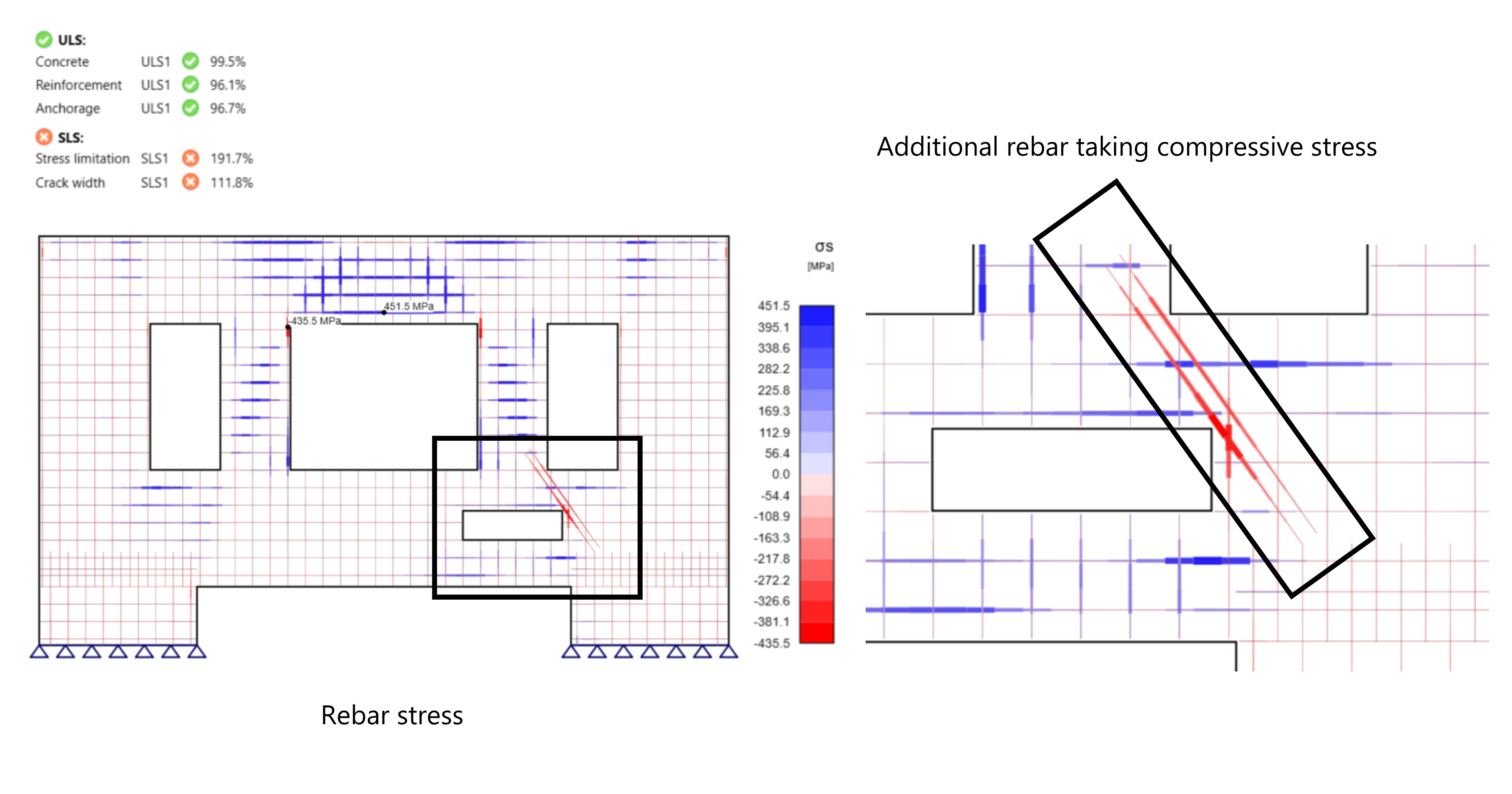 The solution is to add additional rebar to alleviate some of the compressive stress from concrete. This way, the transfer wall can pass the design check as shown below. The requirement to add additional compression rebar would otherwise be missed if engineers did not use IDEA StatiCa Detail.