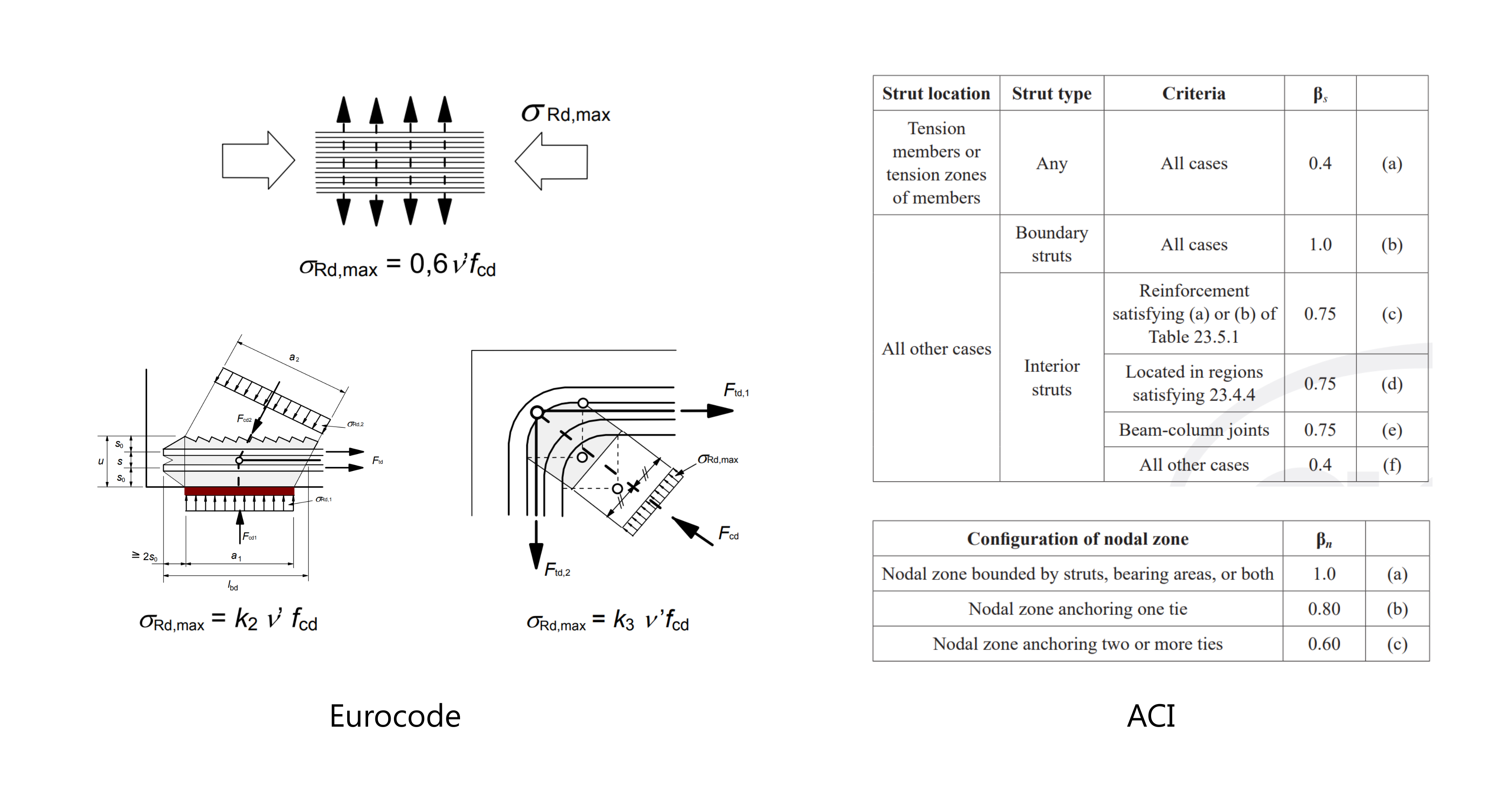 When concrete is placed under heavy compression, it often experiences tensile strains in the perpendicular direction, which is called transverse tension. Once that happens, tiny cracks start to form, and concrete becomes less confined and weaker in compression. This effect, known as compression softening, means that cracked concrete cannot carry as much compressive force as uncracked concrete. In the design code, this effect is considered when designing, for example, a deep beam. In deep beam struts and nodes, a factor of k in Eurocode (or β in ACI) with different values, depending on the situation, is used to reduce the concrete maximum compression capacity due to the compression softening effect.