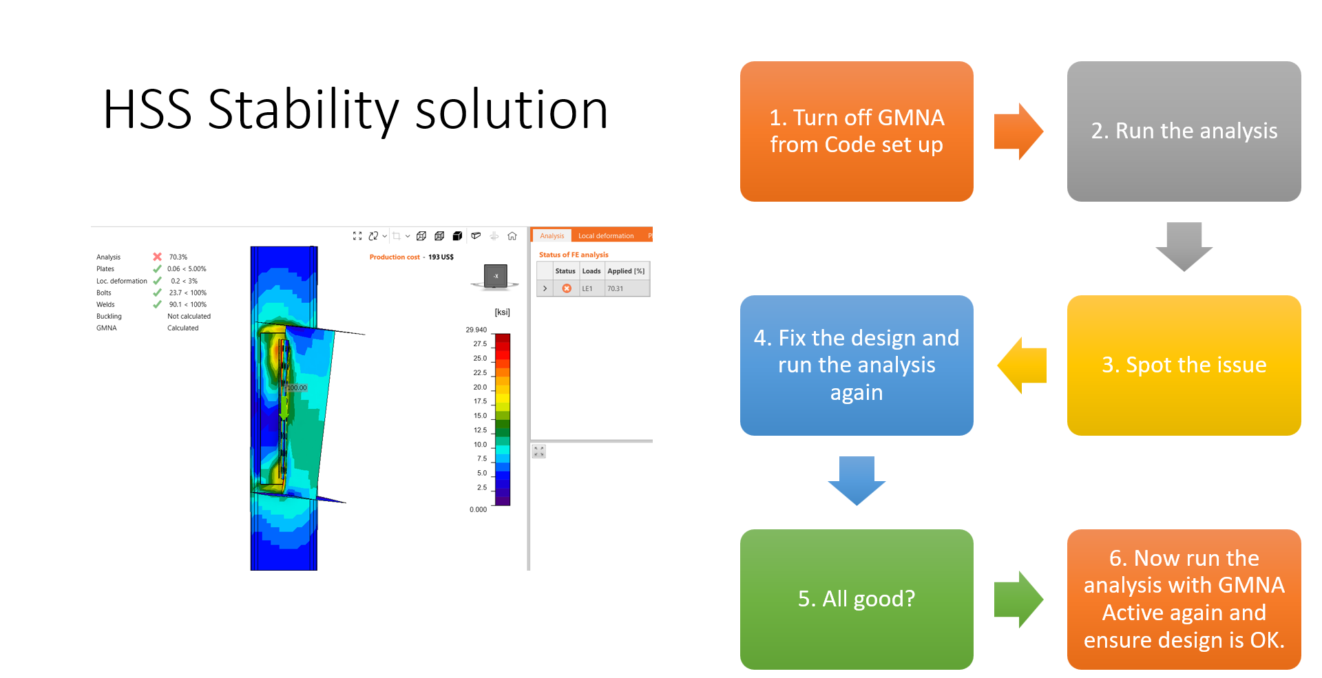 4. Turn off GMNA under code setup and re-run the analysis. Spot the design issue, fix it, and re-run it. If the design is good, return to the Code setup, activate the GMNA again, and ensure the design is OK.