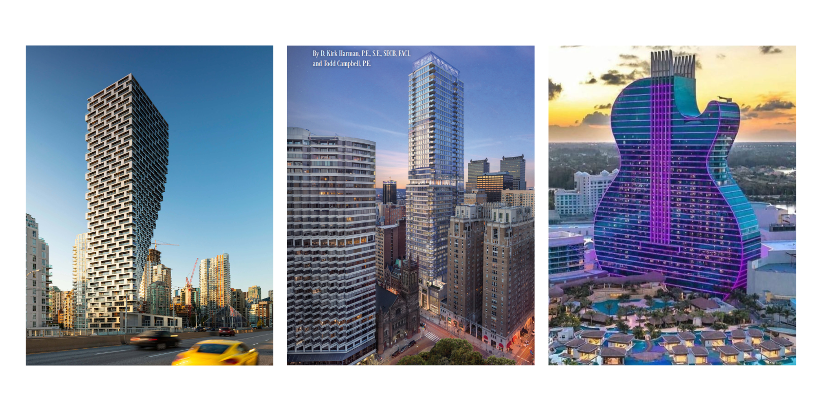 Příklad použití kráčejících sloupů - Vancouver House, The Laurel Rittenhouse Square, Seminole Hard Rock Hotel and Casino od IMEG