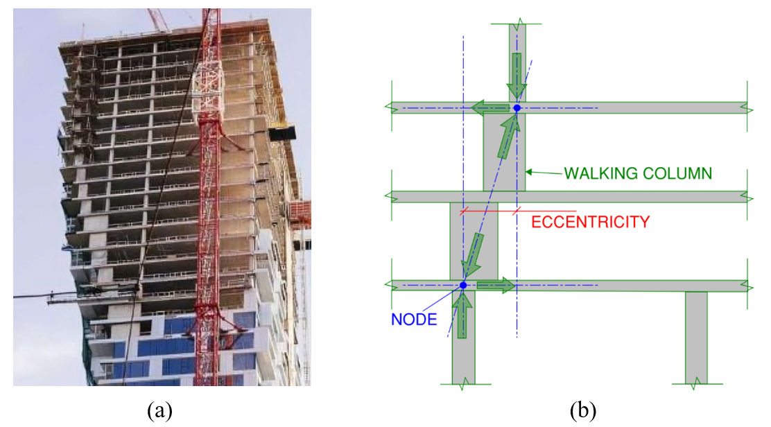 Neprůběžný sloup je konstrukční sloup, který je vodorovně odsazený mezi jednotlivými podlažími a tedy v tomto smyslu kráčí nějakým směrem, což umožňuje postupné posouvání umístění plánu sloupů bez náhlých přenosů zatížení. Na rozdíl od znázorněných šikmých sloupů se kráčející sloupy skládají z vertikálně naskládaných segmentů odsazených na každé úrovni podlahy. Díky tomu je snazší je sestavit a integrovat do konvenčních systémů bednění při zachování relativně přímé dráhy zatížení – což je klíčový princip efektivního konstrukčního návrhu.