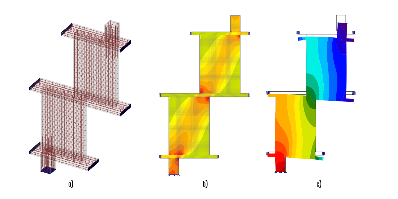 a) Vyztužený model neprůběžného sloupu v IDEA StatiCa, b) Výsledky – napěťová pole betonu a c) Výsledky – průhyb
