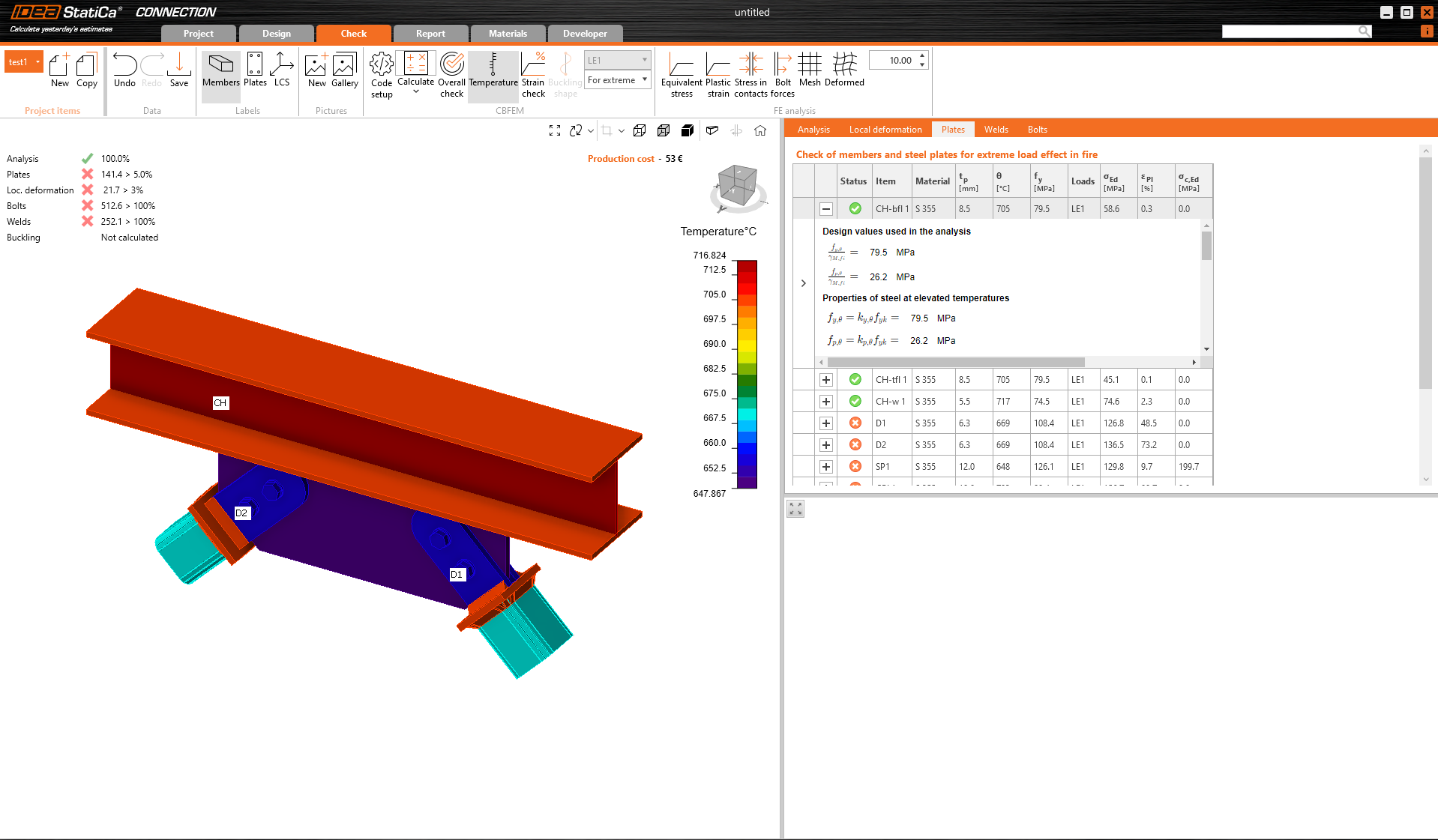 Na základě typu požární křivky a dalších parametrů materiálu a rozměrů vypočítá software přírůstkovou metodou teplotu jednotlivých prvků (desek) v určitém čase podle požární třídy. Teplota šroubů a svarů se bere podle žhavější připojené desky. Automatický výpočet desky je brán podle platných norem a je možné určit, zda je použita protipožární ochrana, či nikoliv. Současně je zachována i možnost ručního zadání teploty jednotlivých prvků.