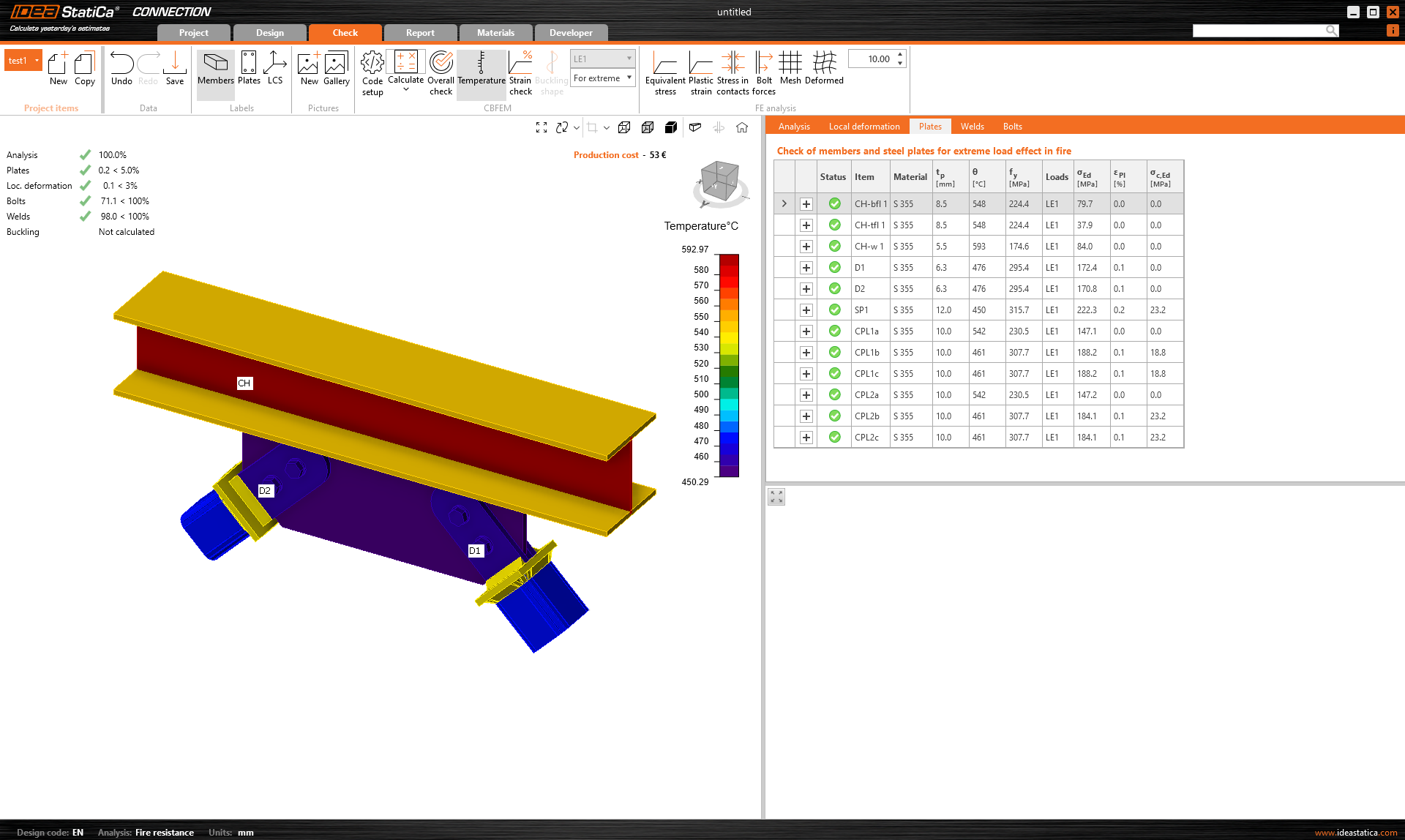 Následující krátká ukázka výsledků analýzy požární odolnosti v programu IDEA StatiCa Connection vám přiblíží chování spoje za různých podmínek a aplikaci teorie.