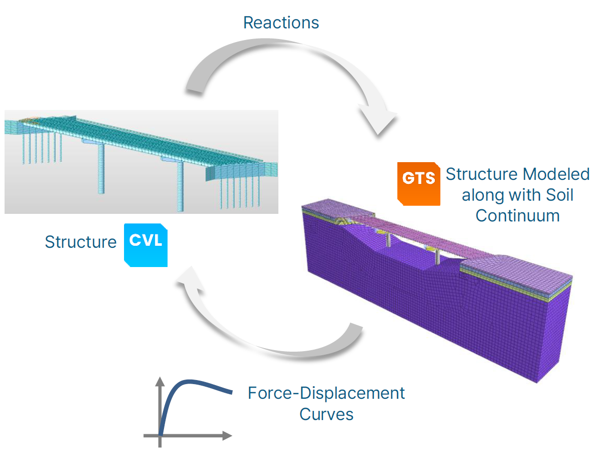 Obě výše zmíněné metody lze velmi efektivně vzájemně kombinovat. Pomocí propojení mezi výpočetními softwary Civil NX a GTS NX lze tuhosti pružin pro nepřímou metodu podepření modelu získat iterací. V prvním kroku je provedena analýza mostu pro dané zatížení. Získané reakce jsou následně načteny do modelu podloží v GTS NX a je proveden nelineární výpočet pro určení odezvy podloží. Výsledná odezva pilot je ve formě nelineárních pružin vrácena zpět do Civil NX, kde je provedena nová analýza mostu.