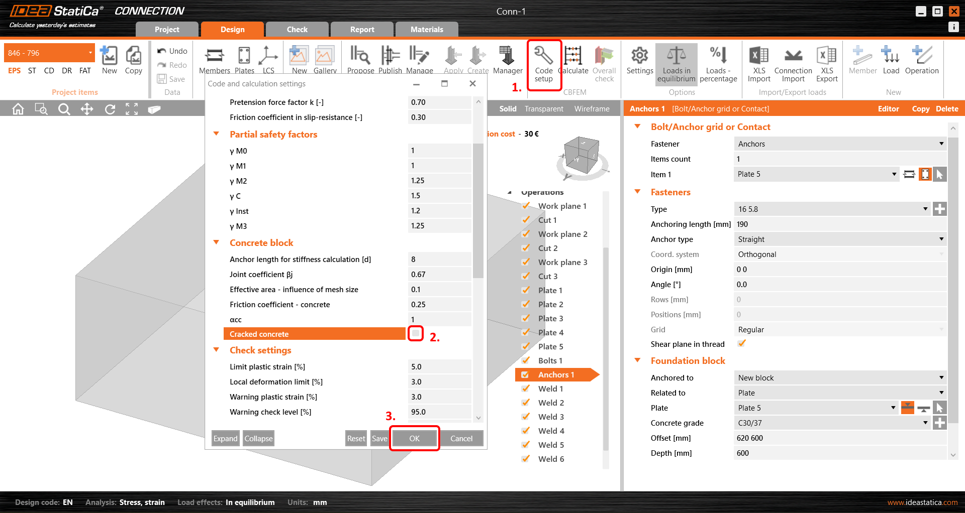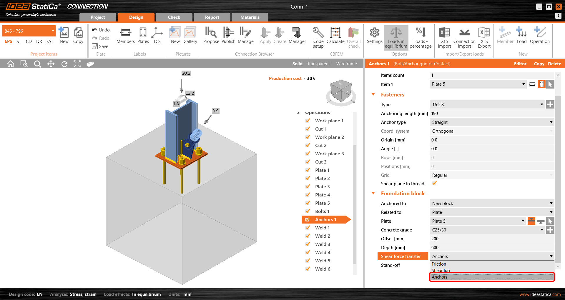 Upravte vlastnosti kotev a betonového bloku. Vyberte možnost Střihová rovina v závitu. Nastavte hodnotu Odsazení na 200 mm. Změňte Třídu betonu na C25/30.