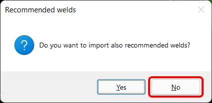 Může se objevit hláška "Chcete importovat i doporučené svary?". Vzhledem k tomu, že máme všechny svary vytvořené v BIM modelu, vyberte tlačítko Ne .