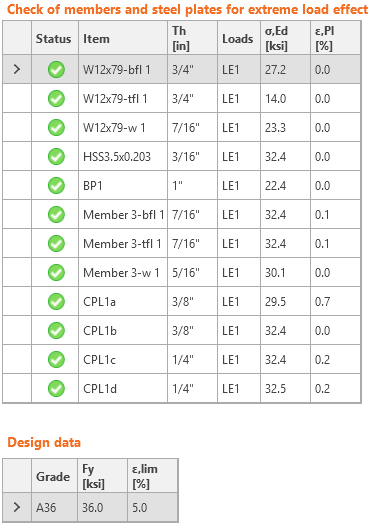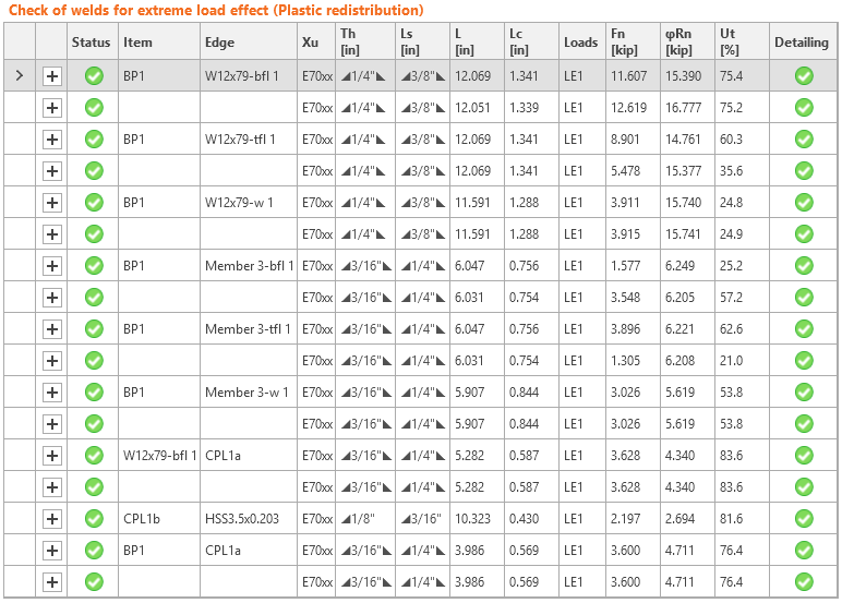 The plates are checked by finite element analysis. The bilinear material model is used with the yield strength multiplied by steel resistance factor \(\phi = 0.9\). The forces acting on other components of the connection, i.e. bolts and welds, are also determined by finite element analysis but their resistance is checked using standard formulas from AISC 360-16, ACI 318-14, and ACI 349-01. The most stressed weld element is checked and with further loading, the stress in weld is spreading into further weld elements. Therefore, the ultimate weld resistance is higher than simply dividing the force by weld utilization.