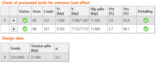 The strength of slip-critical connection is determined according to AISC 360-16 – J3.8. The minimum bolt pretension is taken from Table J3.1 as \(T_b = 35\) kip. The single bolt slip resistance is: