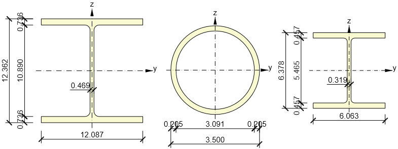 Cross-sections of column (left), brace (middle), and shear lug (right)