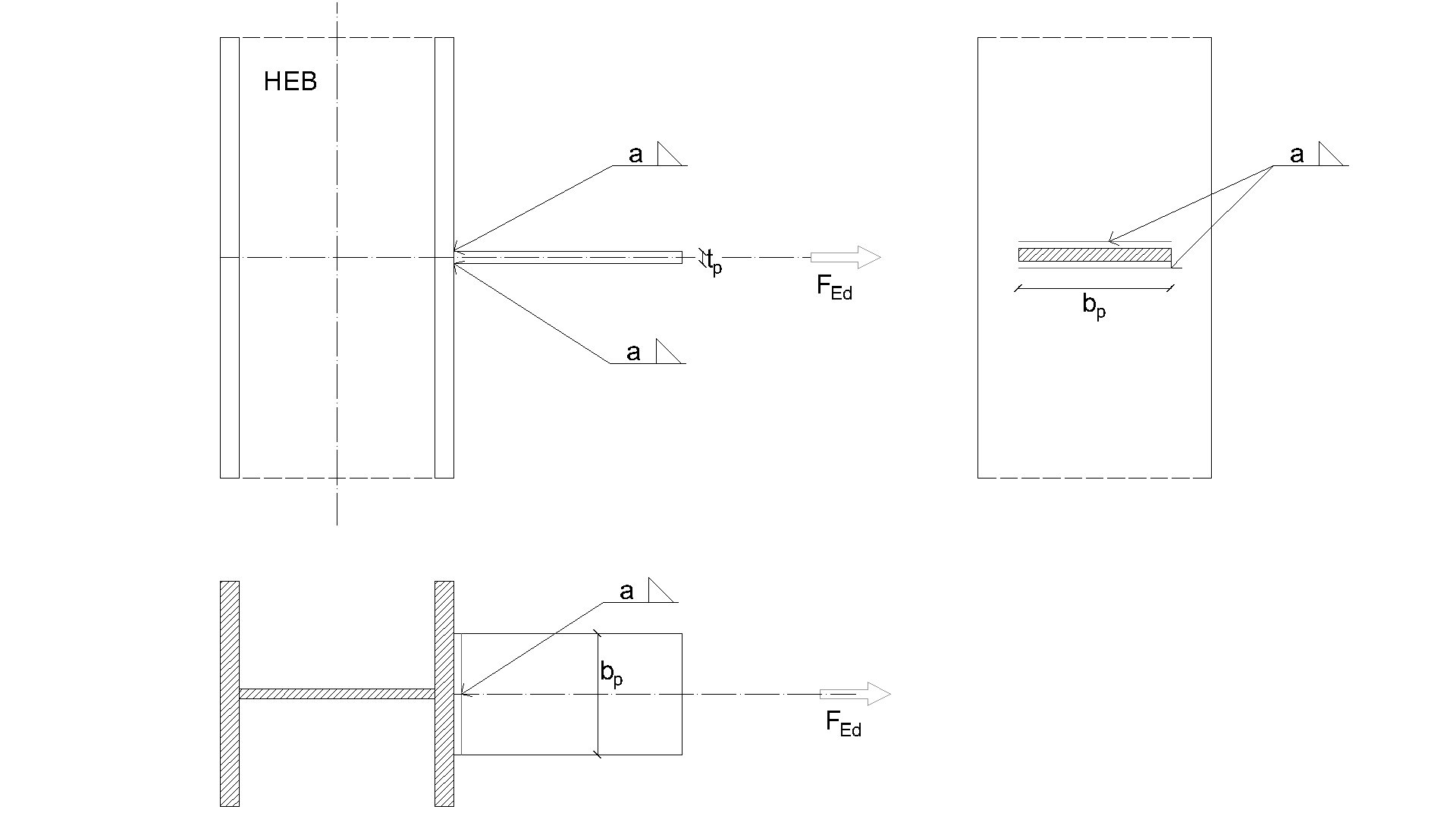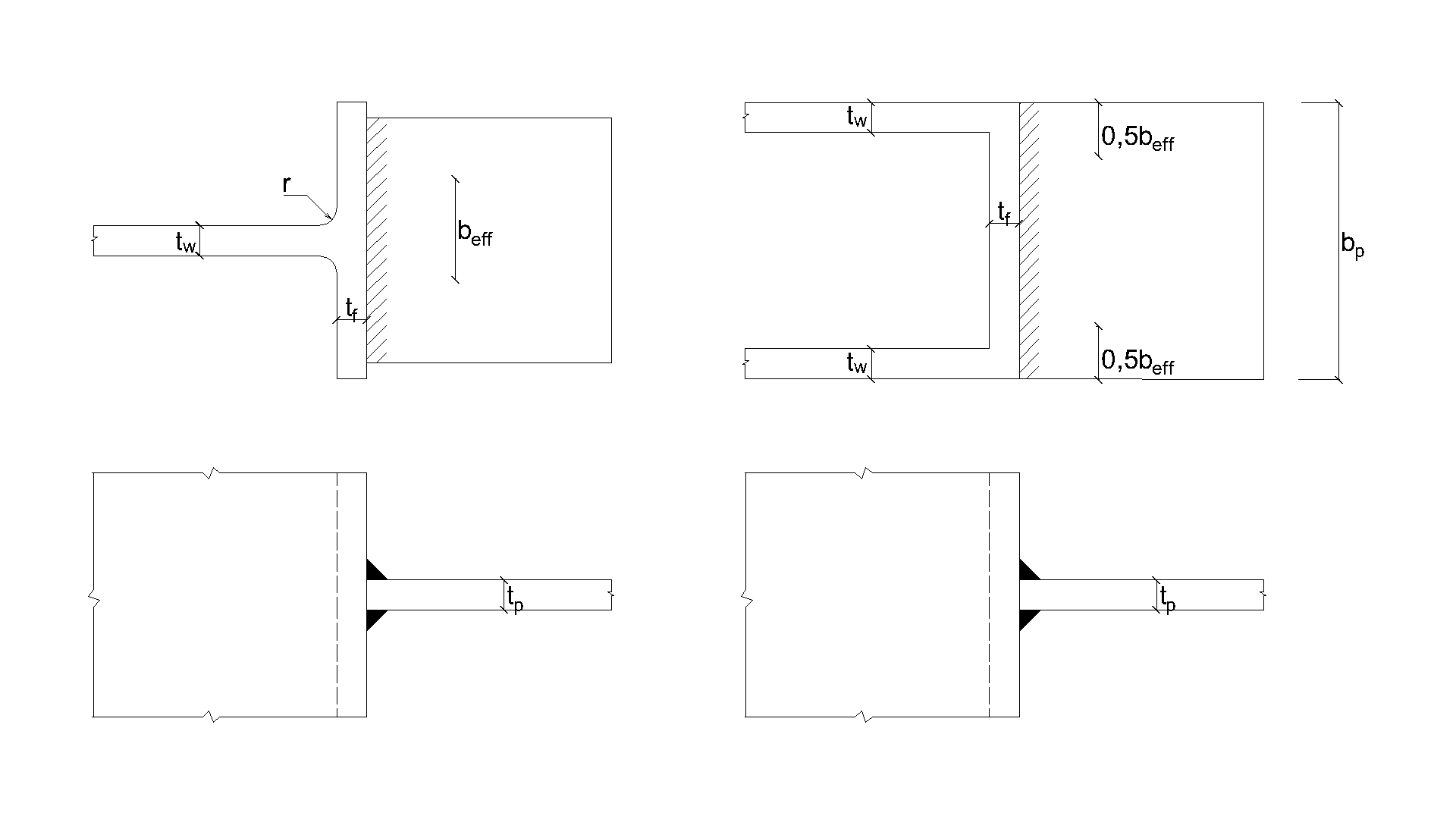 The fillet weld is the only component examined in the study. The welds are designed according to Chapter 4 in EN 1993-1-8:2005 to be the weakest component in the joint. The design resistance of the fillet weld is described in Section 4.1. The force applied perpendicular to a flexible plate, which is welded to an unstiffened section, is limited. The stresses are concentrated in an effective width while the weld resistance around the unstiffened parts is neglected, as shown in Fig. 4.5.1. For an unstiffened I or H section the effective width is obtained according to: