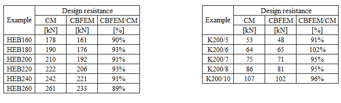 The results of the sensitivity study are summarized in a diagram comparing design resistances of CBFEM and CM; see Fig. 4.5.5 illustrating the accuracy of the CBFEM model.