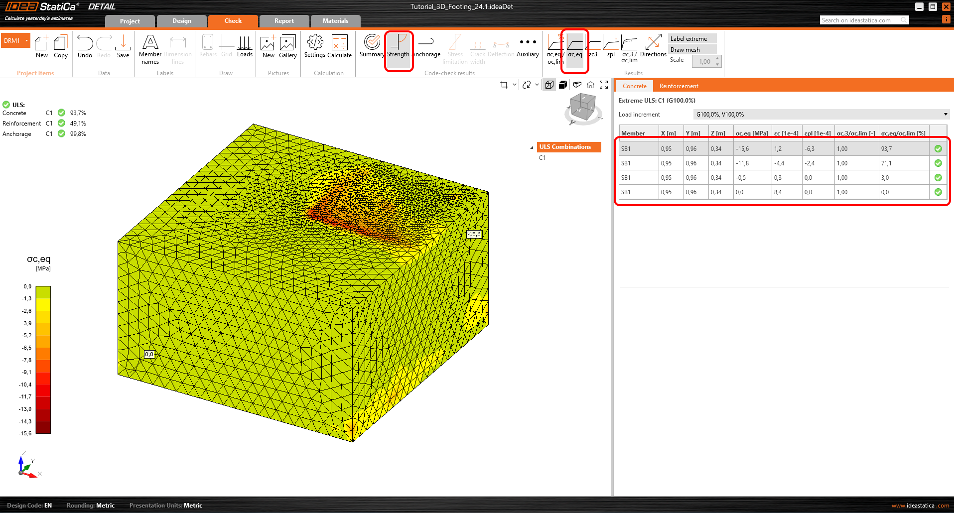 Efektivní hlavní napětí (EPS) v betonu se stanovuje z trojosé napjatosti betonu a porovnává se přímo s návrhovou pevností betonu v jednoosém tlaku fcd. Vztah maximálního vypočteného tlakového napětí v betonu σc3 a efektivního hlavního napětí je vyjádřen součinitelem kappa. Více informací o efektivním hlavním napětí je v tomto článku: 3D Detail – železobetonové patky (BETA).