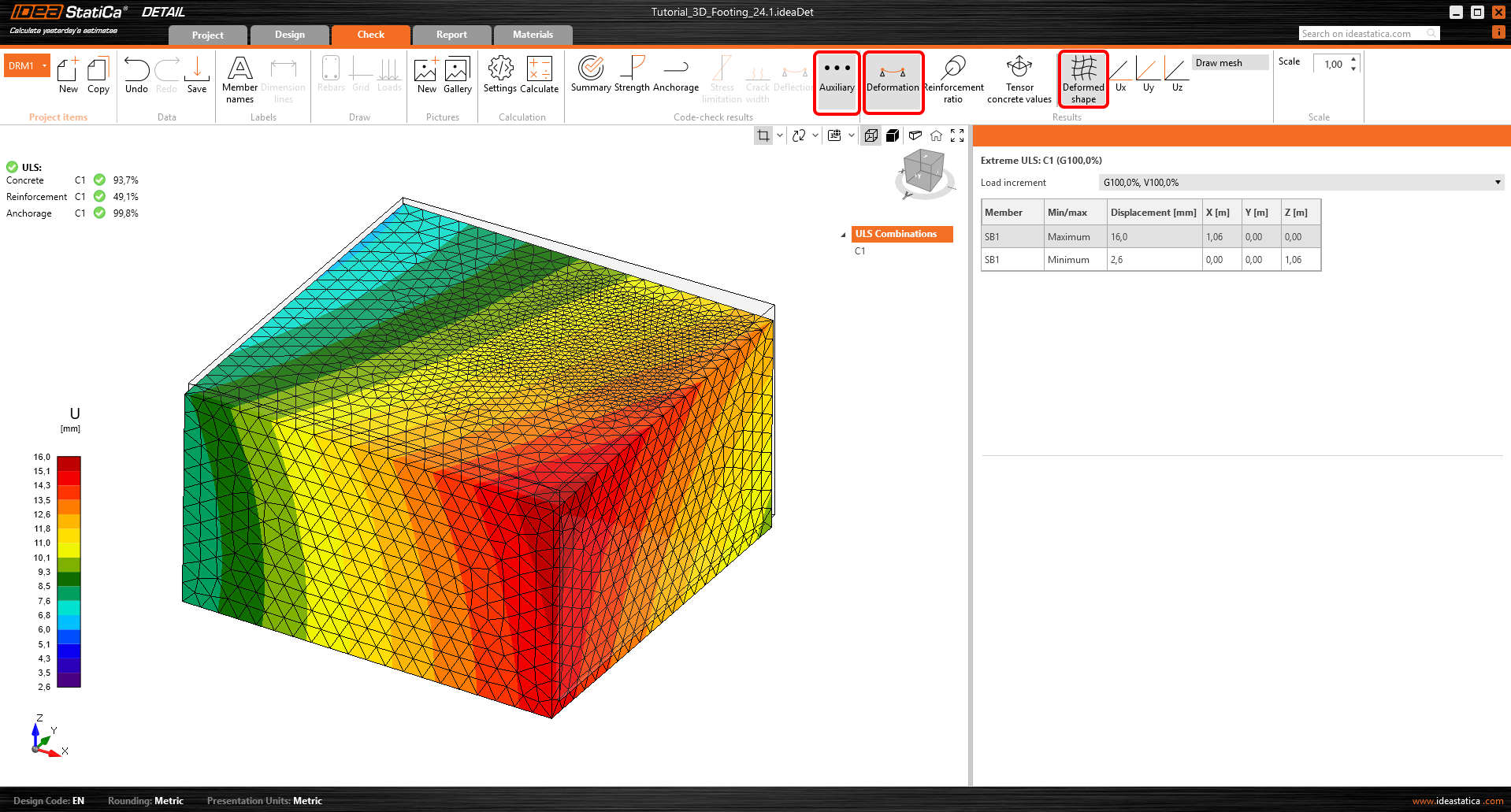 Vezměte prosím v potaz, že aplikace nenahrazuje geotechnické ověření základů. Nekontroluje hodnotu napětí v základové spáře a nekontroluje stabilitu základů. Pokud je ohybové zatížení od sloupu příliš velké v poměru k vlastní tíze, dojde k překlopení patky (projeví se jako divergující analýza nebo velké deformace/pohyby).