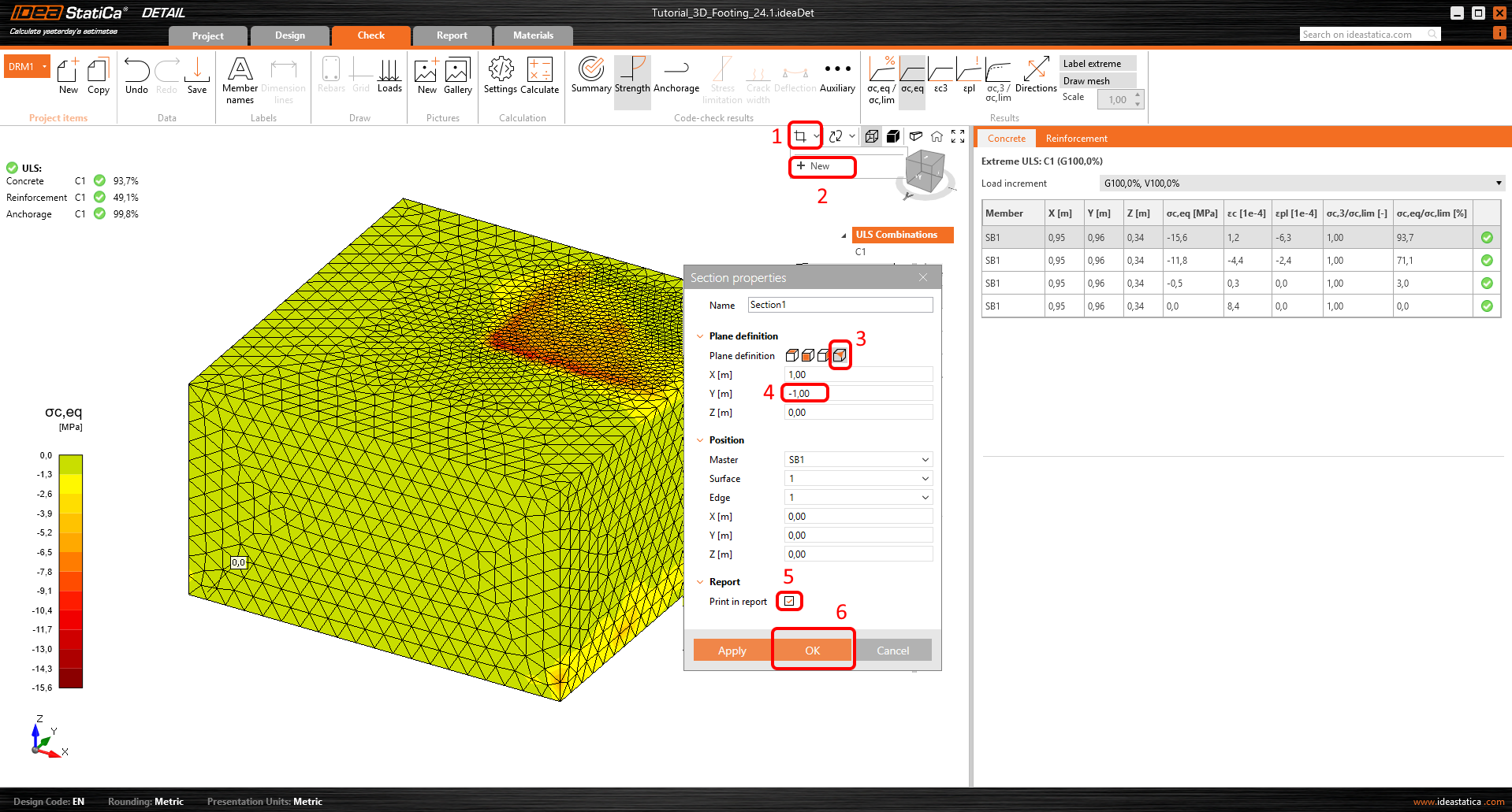Po dokončení analýzy se v levém horním rohu obrazovky zobrazí stručný přehled výsledků. Můžete přepnout na kartu Posudek. Zobrazí se souhrnné výsledky, které ukazují tok napětí v betonu i ve výztuži.