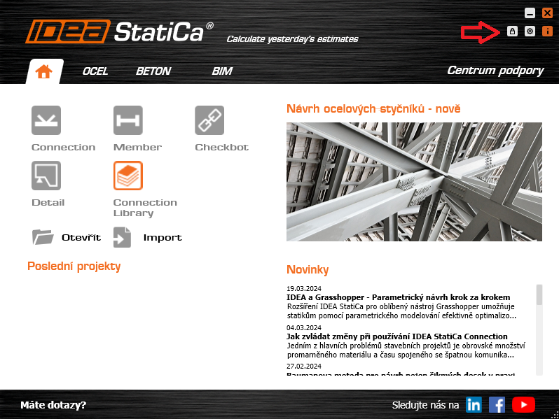 Spusťte IDEA StatiCa a otevřete nastavení licencí (kliknutím na ikonku "zámečku").