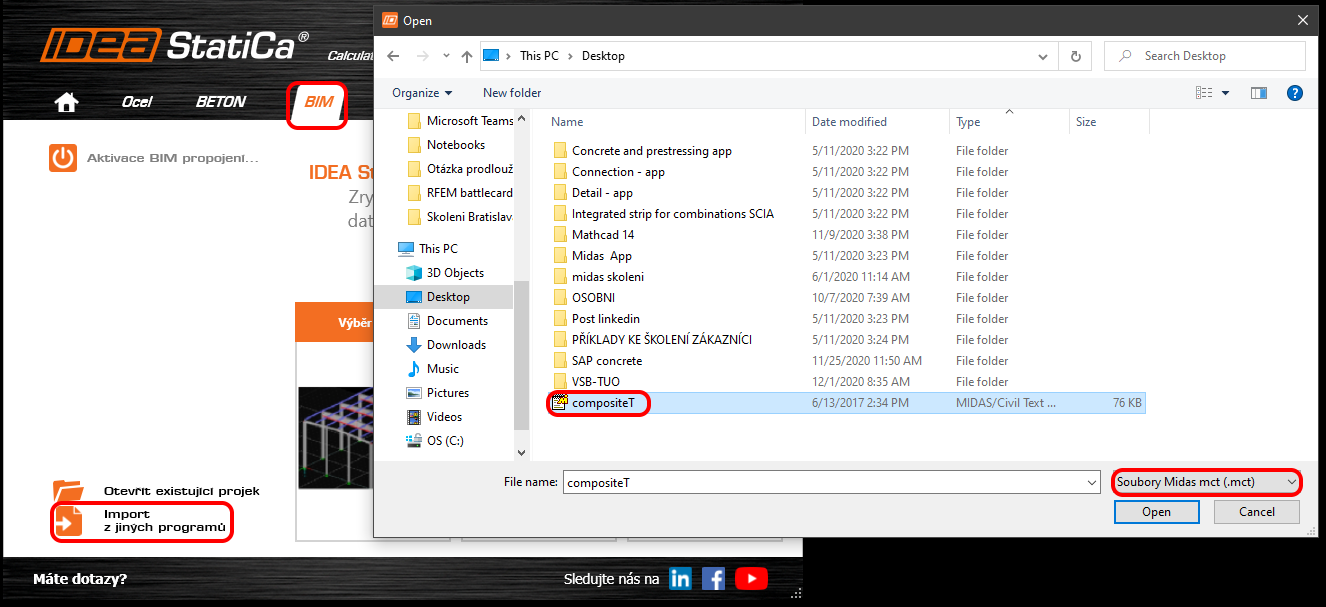 Spusťte aplikaci IDEA StatiCa a přejděte do záložky BIM, kde vyberte Import z jiných programů. Posléze vyberte soubor compositeT.mct. Je nutné mít vybráno Soubory Midas mct., aby se soubor ve Vámi zvoleném adresáři zobrazil k výběru.