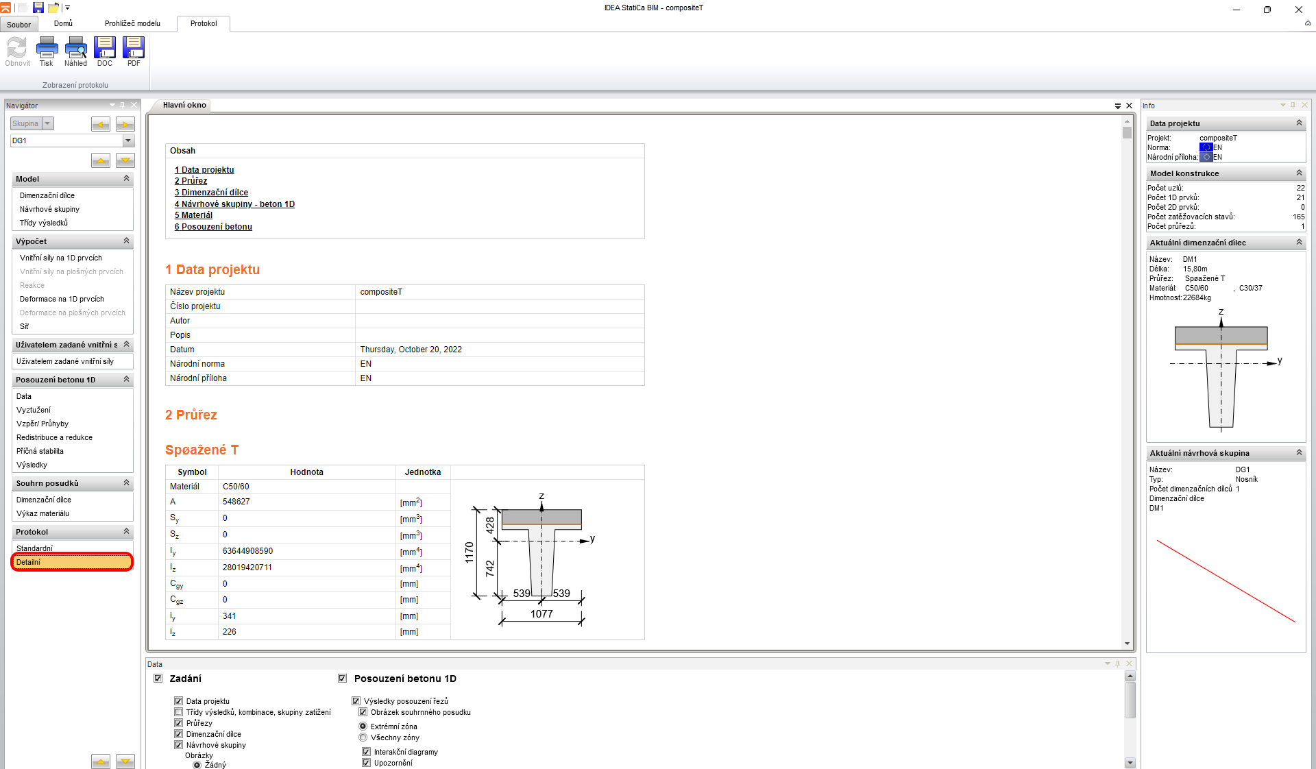 V posledním kroku se přepnete do části Protokol na záložku Detailní. IDEA StatiCa nabízí plně editovatelný protokol, který si můžete vytisknout nebo vyexportovat.