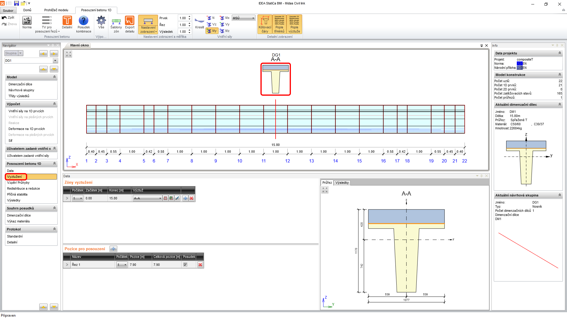 Další částí návrhu je vyztužení prvku. Pro jednoduchost návodu nebudete pracovat s více než jedním řezem pro posudek a více než jednou zónou vyztužení. Kliknutím na tvar průřezu zóny A-A se otevře editor vyztužení.