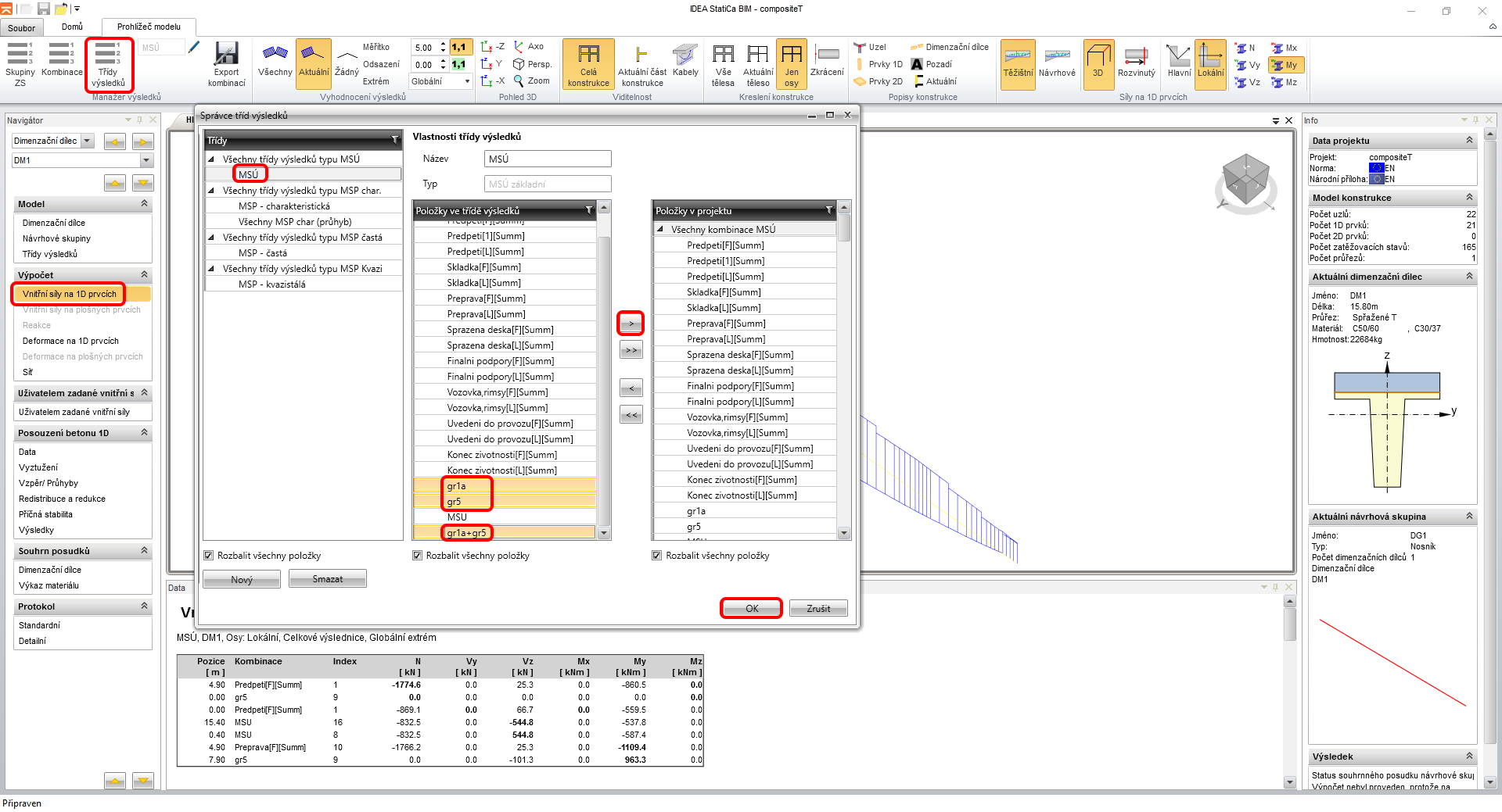 Když přepnete na záložku Výsledky můžete přepínat mezi posudky a sledovat mezivýsledky a vstupní/výstupní hodnoty. Nalevo v navigátoru se nachází také přepínač řezů a extrémů, pro které výsledky zobrazujete. Na dalším obrázku zobrazujte fázi předpínání, tedy spřažená deska ještě neexistuje.