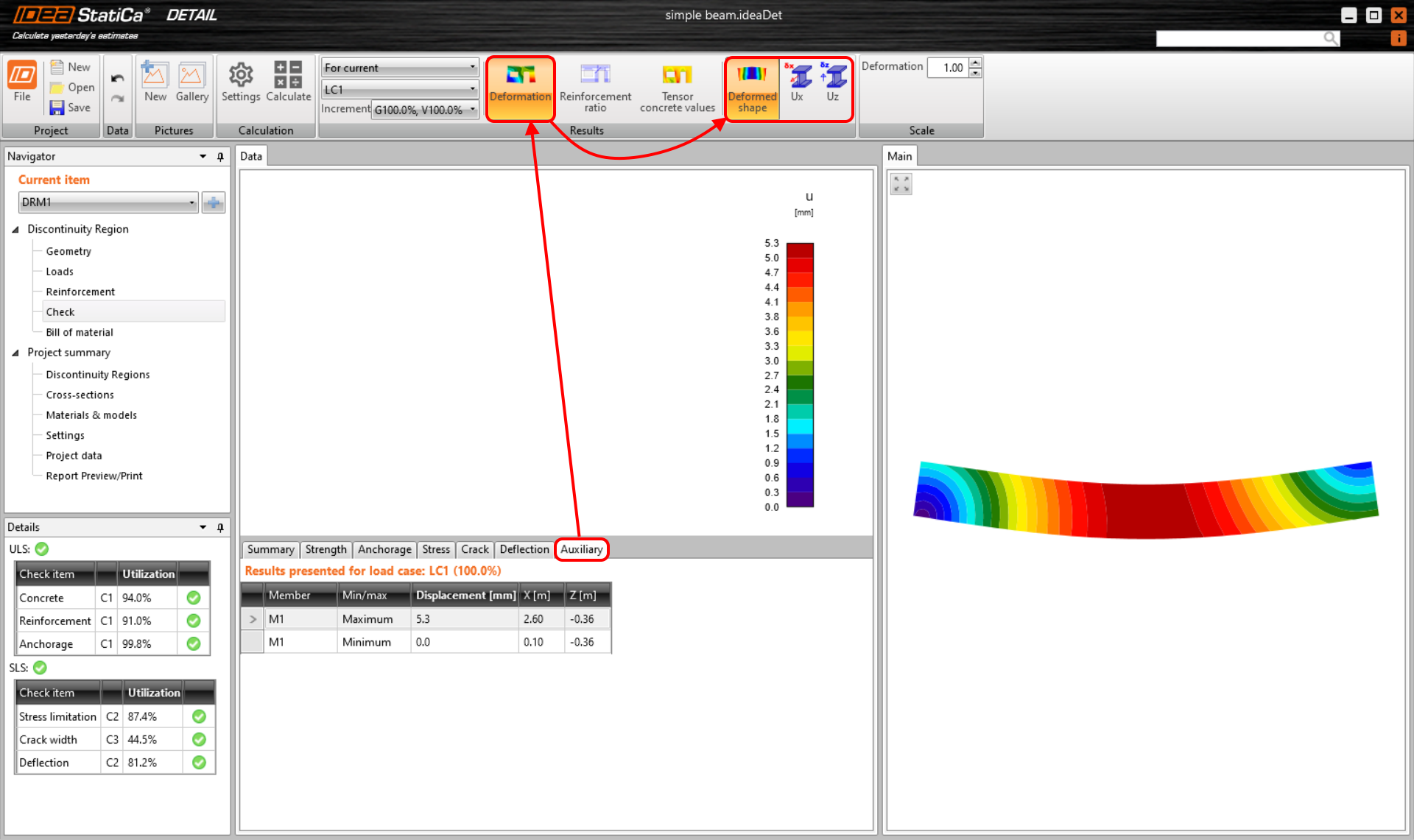 Deformace na kartě Pomocný se počítá nelineárně (přípustné plastické deformace) pro kombinace MSÚ a pro jednotlivé zatěžovací stavy, na rozdíl od výsledků průhybu, které se pro charakteristické kombinace počítají lineárně. Součinitel dotvarování se ve výsledcích deformace na kartě Pomocný neuvažuje.