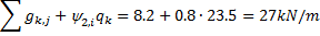 Charakteristické hodnoty zatížení: Vlastní tíha: Σgkj = 8.2 kN/m, Dlouhodobé účinky proměnného zatížení: qk = 23.5 kN/m.