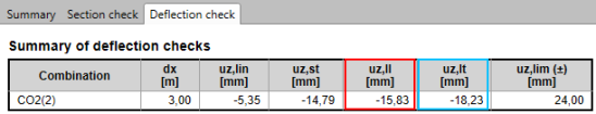 Vypočtené hodnoty průhybů v červeném obdélníku v tabulce reprezentují dlouhodobé průhyby způsobené účinky dlouhodobého zatížení včetně účinků dotvarování (Kvazistálá kombinace).