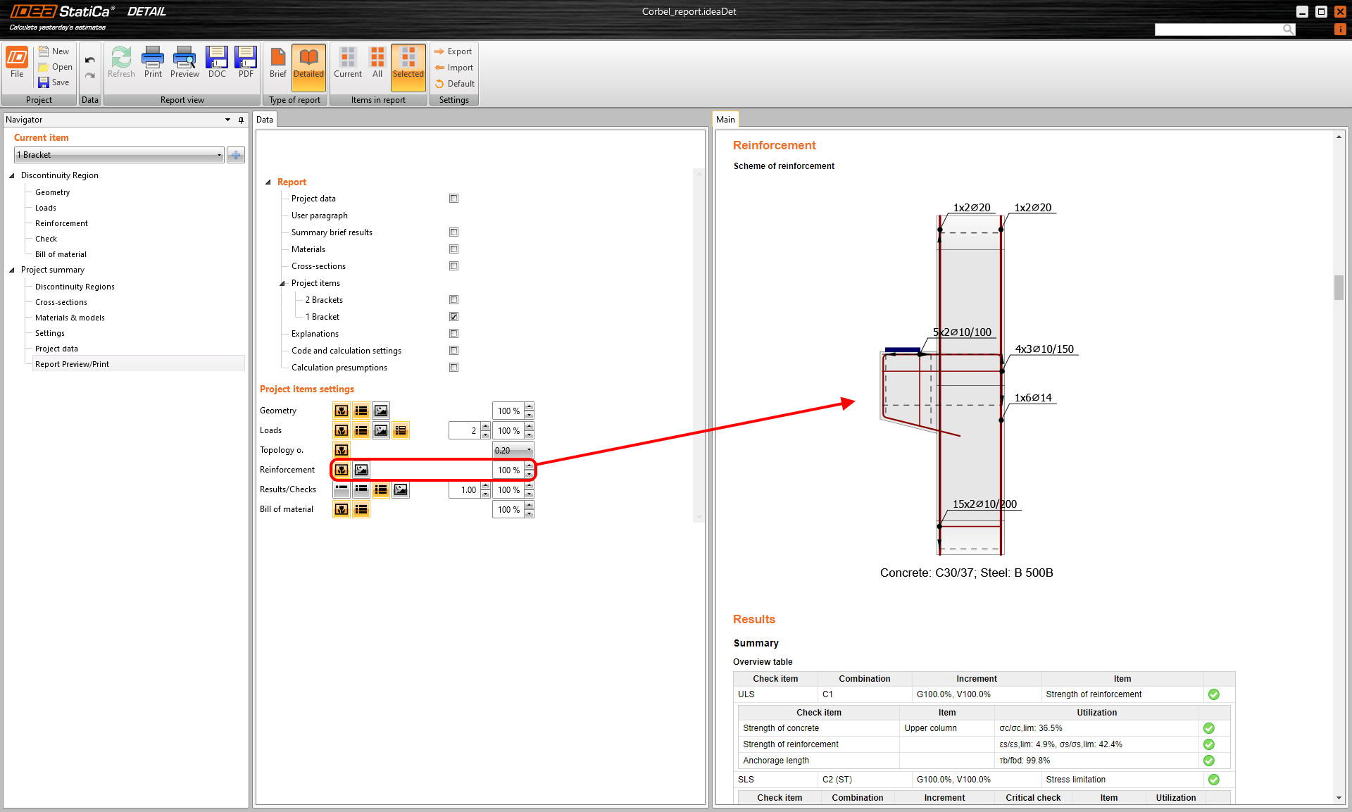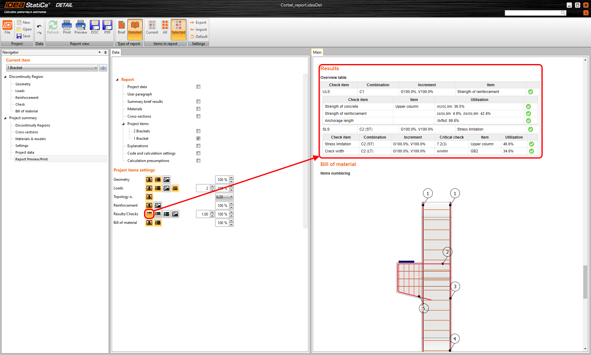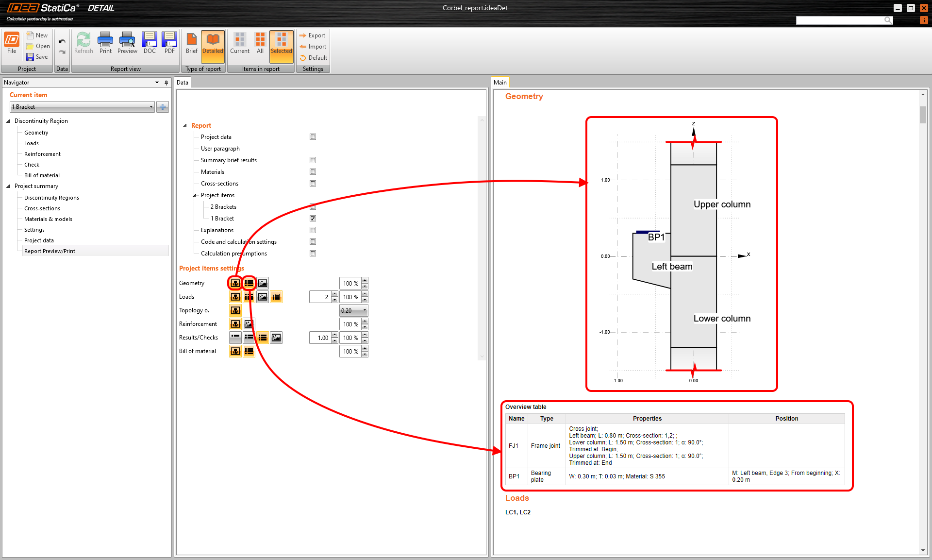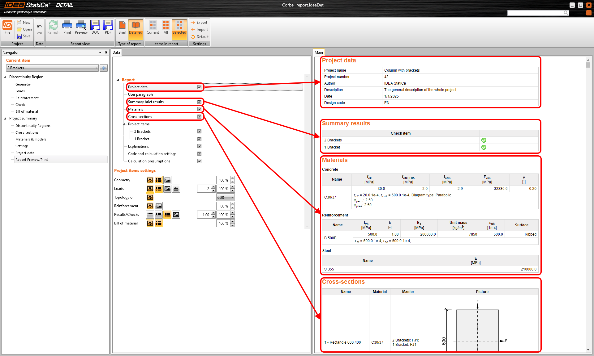 V aplikaci IDEA Statica Detail je možnost mít v jednom souboru více položek projektu (oblastí diskontinuity). A tedy i pro sestavu je možné vygenerovat všechny položky projektu nebo jen vybrané. Výběr se provádí na kartě Data v nastavení protokolu.