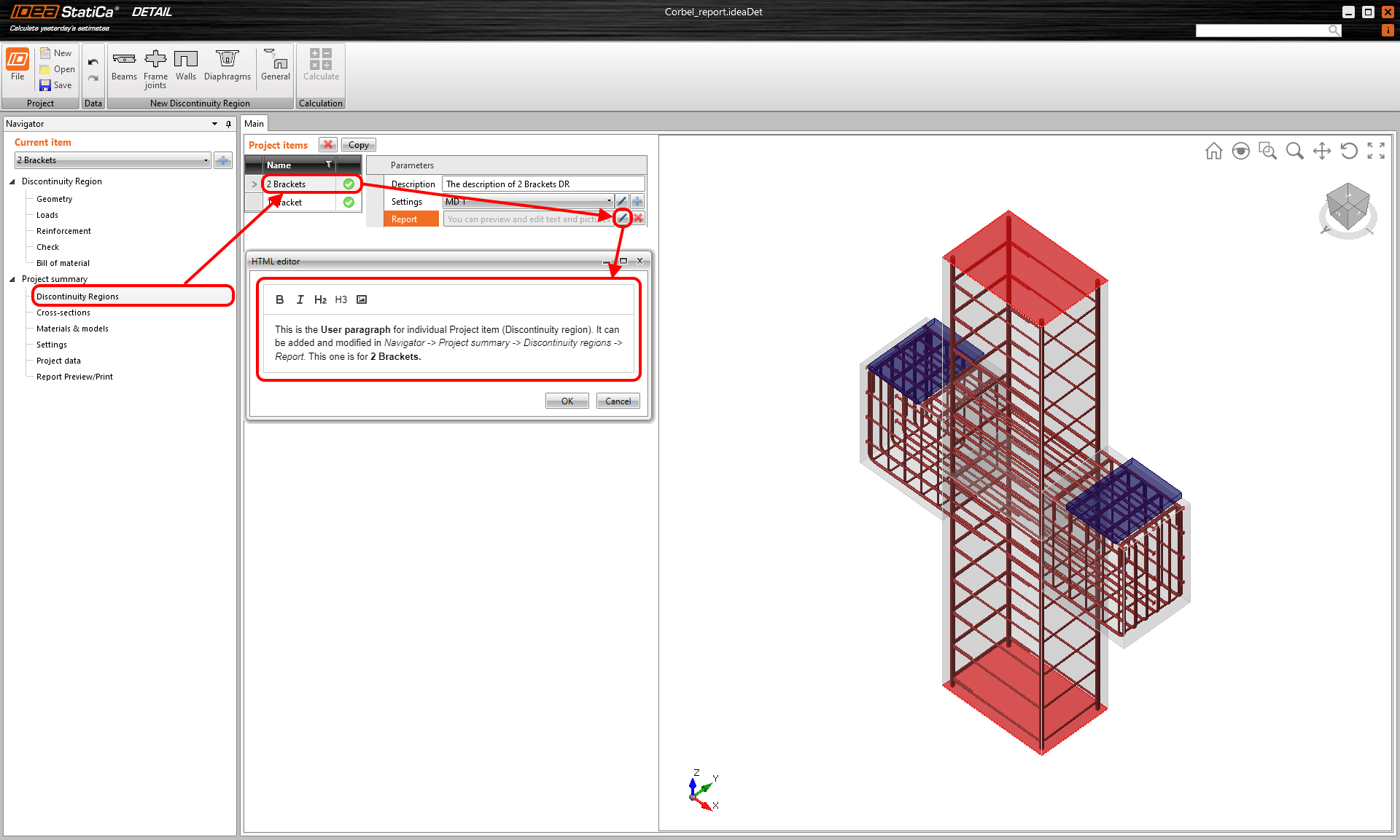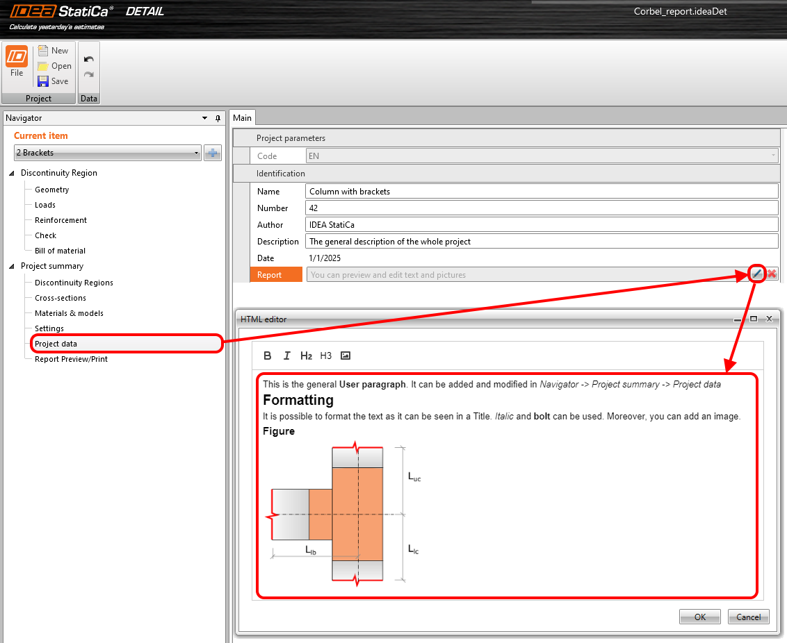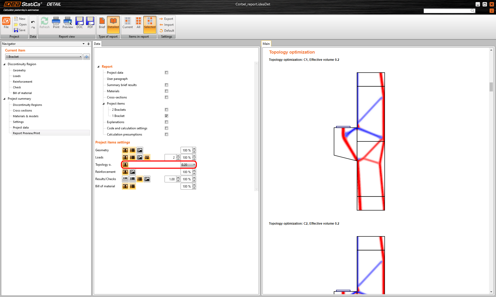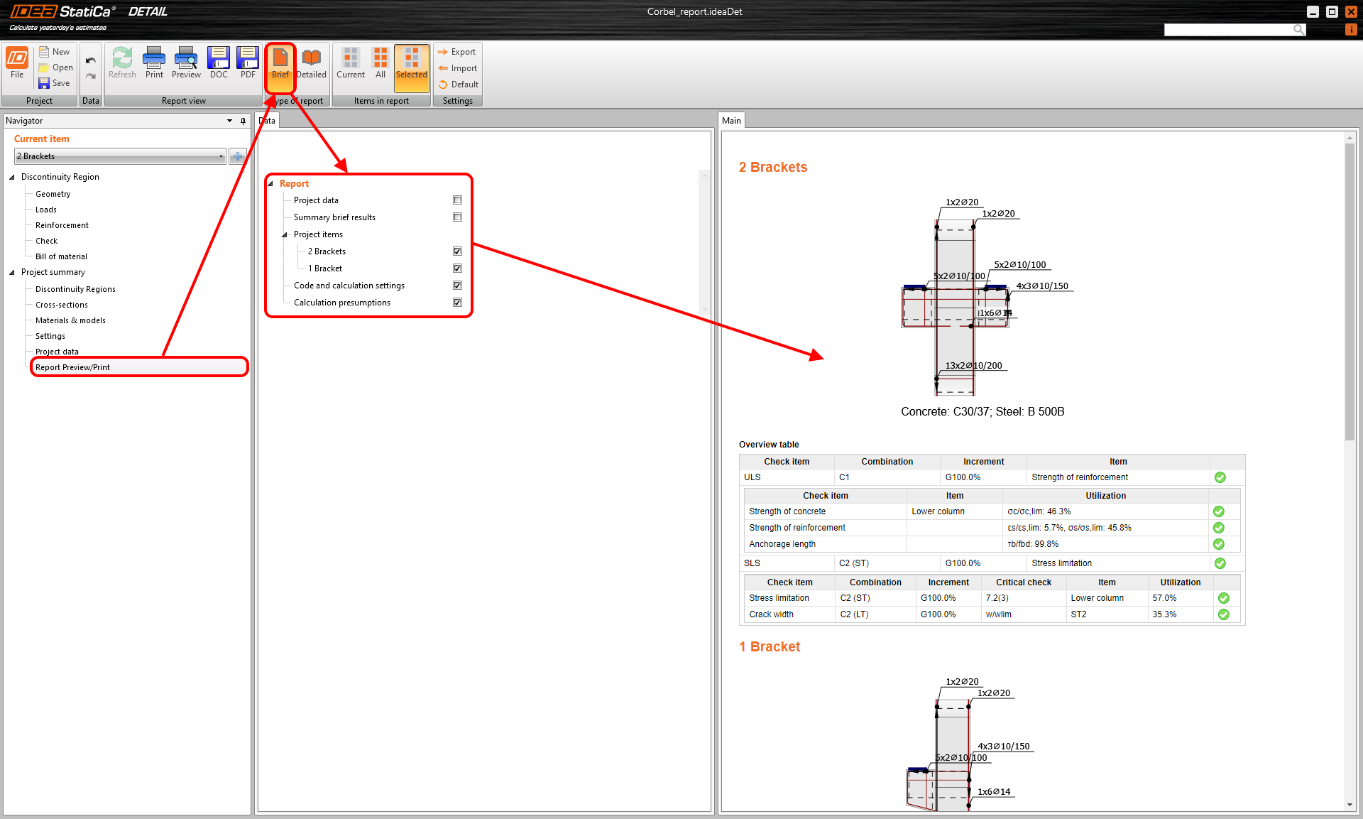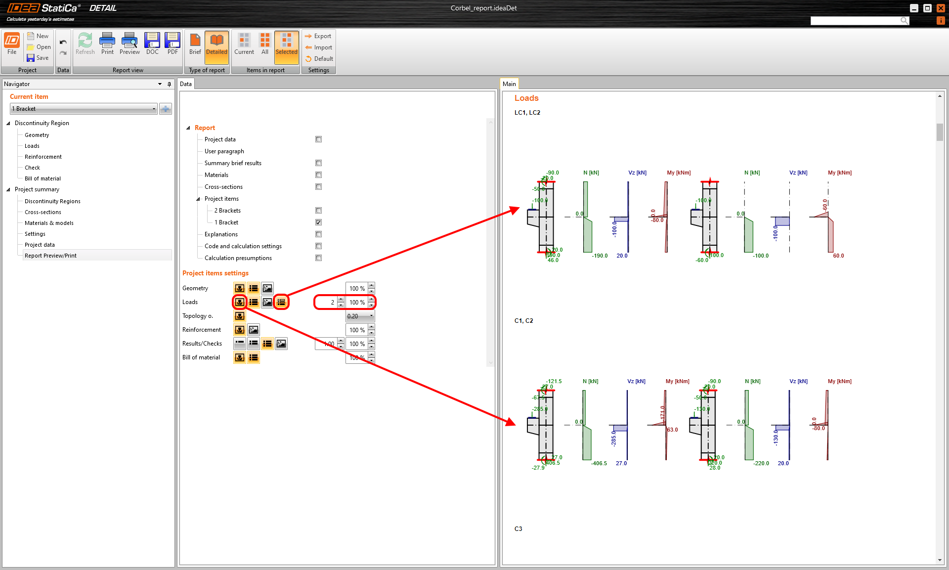 V aplikaci IDEA Statica Detail je možnost mít v jednom souboru více položek projektu (oblastí diskontinuity). A tedy i pro sestavu je možné vygenerovat všechny položky projektu nebo jen vybrané. Výběr se provádí na kartě Data v nastavení protokolu.
