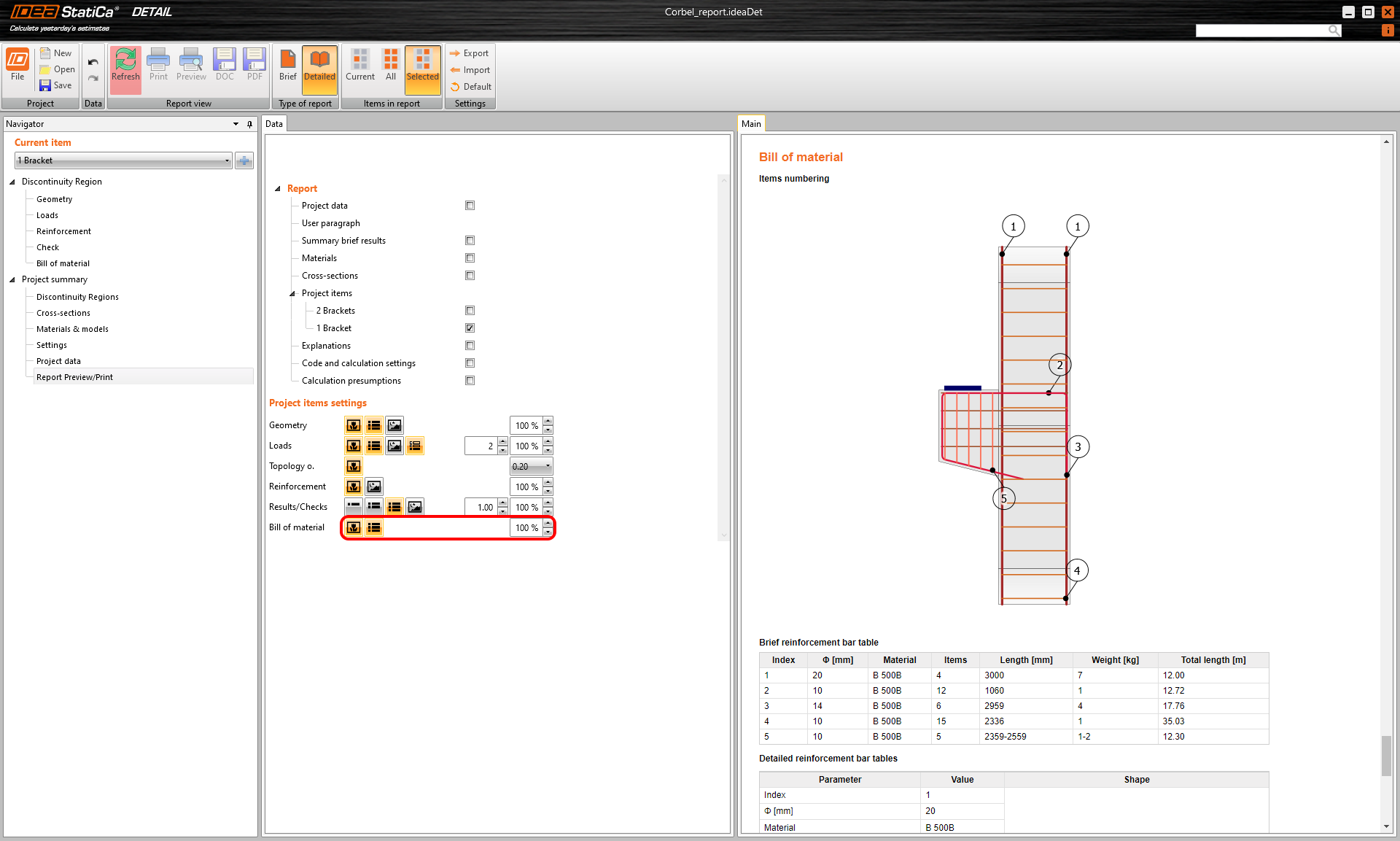 Klikněte na tlačítko Výkaz materiálu v navigátoru a zkontrolujte hmotnost, počet položek, tvary a délky výztuže. Kromě toho lze z aplikace IDEA StatiCa Detail exportovat výkres rozvržení výztuže včetně tvarů výztužných prutů do souboru Dxf. Tento výkres lze dále upravovat.