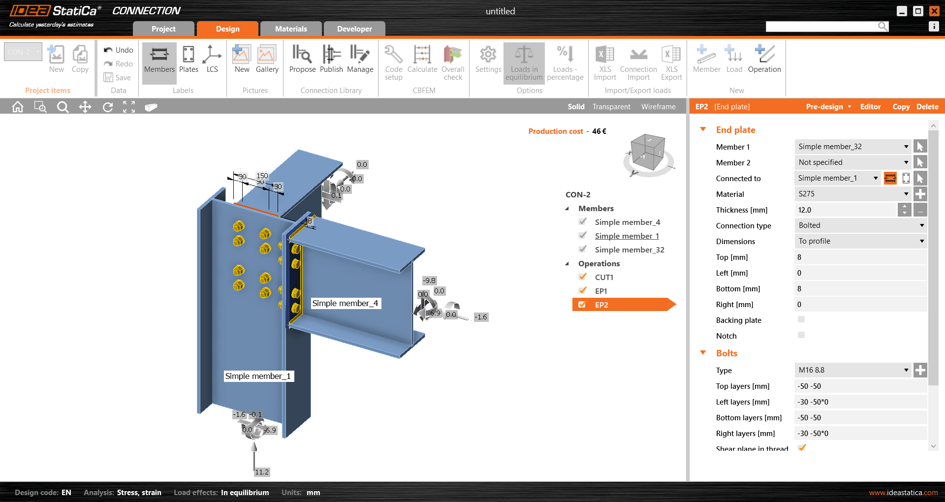 The member is added to the list together with corresponding joints, related members and load combinations without having to manually enter these. Leave the default settings and start configuring the connections first.