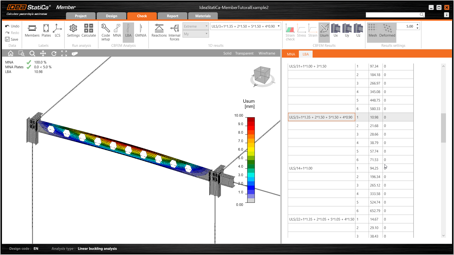 In the next step, switch the analysis type to LBA (Linear buckling analysis) and run the analysis again by clicking Calculate.