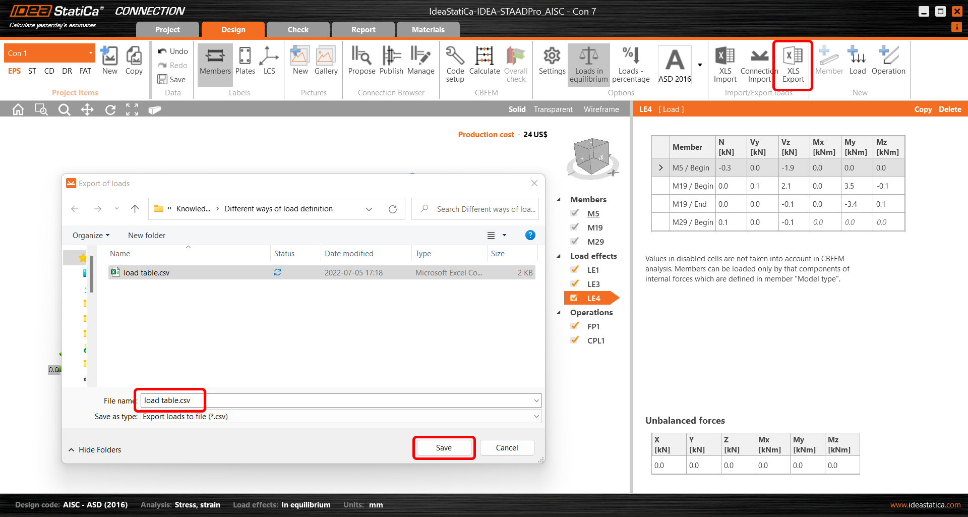 Chcete-li přenést zatížení z jednoho modelu IDEA StatiCa Connection do jiného, můžete také exportovat hodnoty do tabulky pomocí tlačítka Export do XLS v horním pásu. Účinky zatížení se uloží jako soubor CSV. Nicméně existuje i jednodušší způsob popsaný v části 4 (Přenos zatížení z jednoho Connection projektu do druhého).