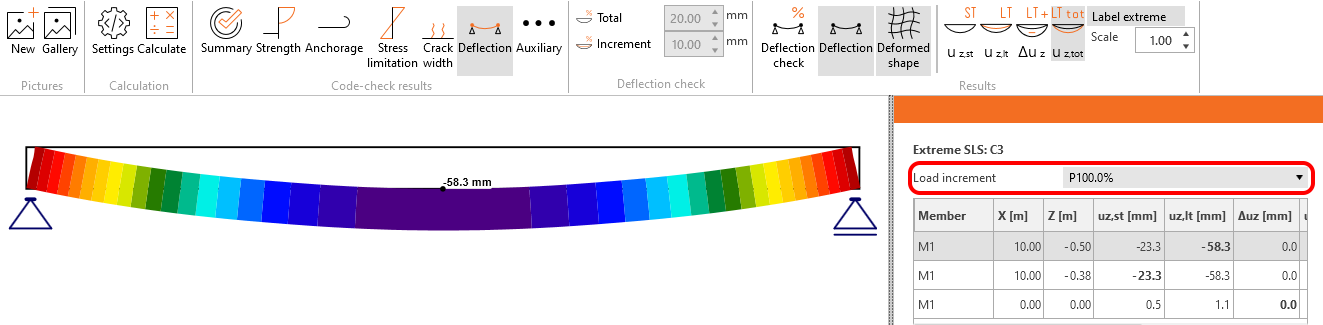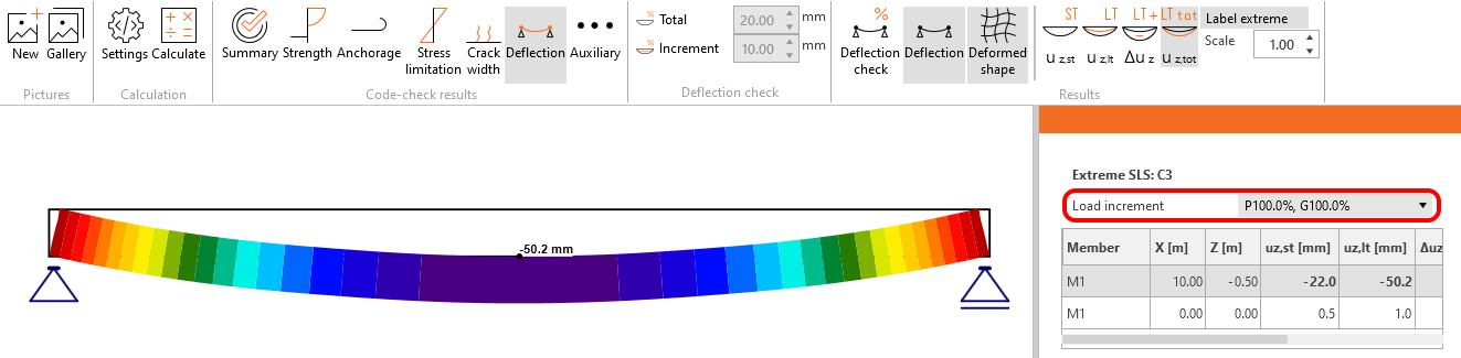 In the second step of the calculation (in the second increment), the permanent load type (G100%) containing self-weight is applied. The deformation of the beam will be as follows: