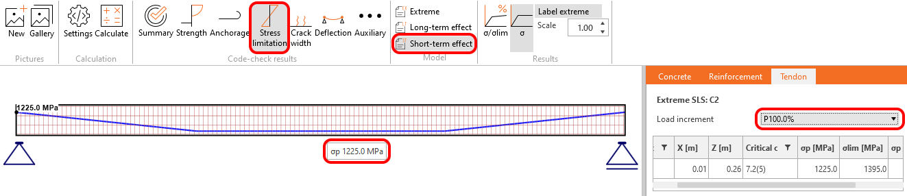 The stress in the tendon for the second increment is 1365 MPa. Which is 111% of the specified value. It is because the stress in the tendon is increased by the difference in the strain of the concrete fibres adjacent to the cable between the first and second steps of the calculation (additional stress caused by deflection of the beam).
