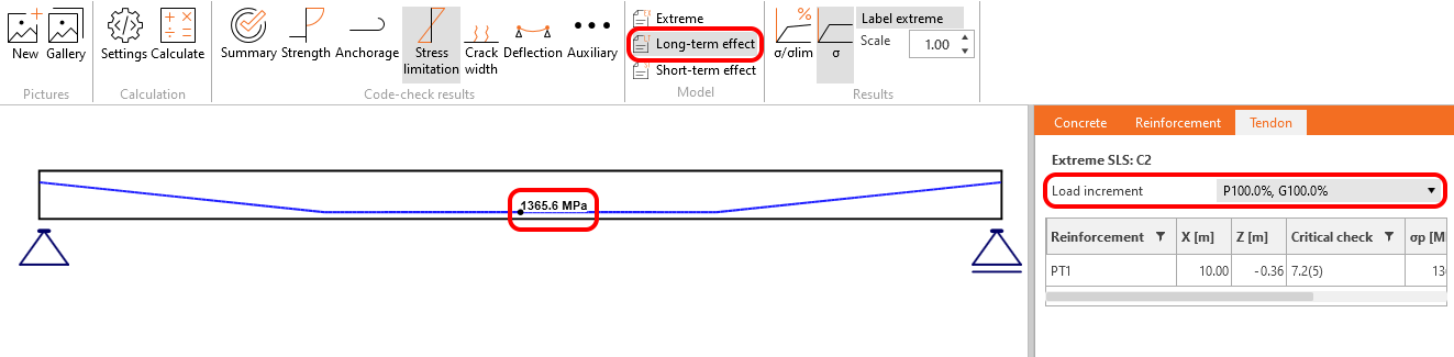 If the self-weight is specified in the Prestressing Load type, the tendon stress in the P100%+G100% state is equal to the set value. Other long-term loads can be included in the Permanent Load type that will be applied to the structure at a later date and can therefore affect the tendon stress.