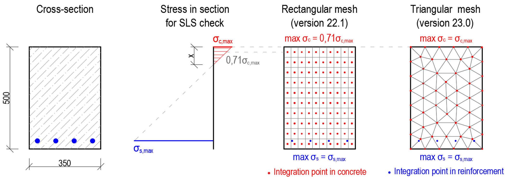 V aplikaci Member byla pro betonové průřezy implementována trojúhelníková síť konečných prvků. Dříve používaná obdélníková síť byla pro prvky v ohybu dostačující pouze v případě, že byla definována velmi jemná síť. Důvodem je, že výsledky se počítají v integračních bodech umístěných v těžišti každého konečného prvku, takže nepočítáme skutečné napětí na okraji průřezu. Výsledky jsou pak velmi citlivé na velikost sítě, zejména u prvků v ohybu, u nichž může být tlačená oblast v betonu vysoká jen několik centimetrů. Jemnější síť, a tedy velké množství konečných prvků, způsobuje zpomalení výpočtu i zobrazení výsledků ve 3D scéně.
