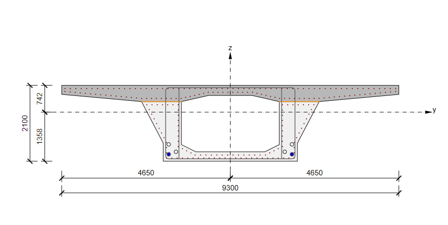 An important part of the whole project is a 1.2 km long overpass, which is realized by three separate bridges. The overpass goes over the floodplain of the Mže river and crosses some country roads, two roadways and one access road. The part of the bridge that was designed in IDEA StatiCa is the three span bridge erected using the balanced cantilever method. The total length of this bridge is 188 m with a theoretical length of the main span of 85 m. The height of the superstructure is 2.1 m in the middle of the span and 5 m at the pier. The bridge is 7.5 m wide between the barriers and carries traffic in both directions. In the future, a parallel bridge and directional traffic distribution are planned.