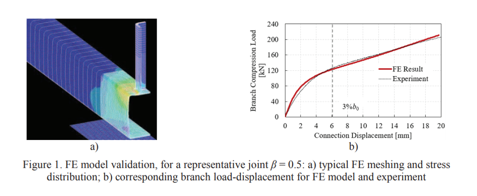 Für die Bemessung von geschweißten Hohlprofilverbindungen im Onshore- und Offshore-Bau gibt es inzwischen eine Reihe von Bemessungsrichtlinien und -normen mit erheblichem internationalem Konsens. Diese decken jedoch typischerweise relativ standardisierte Verbindungstypen, Geometrien und Belastungsfälle ab. Bei ungewöhnlichen Verbindungen ist es mittlerweile üblich, eine Finite-Elemente-Modellierung (FE) durchzuführen, aber es müssen spezifische Richtlinien zu akzeptablen FE-Modellierungsverfahren und der Interpretation der Ergebnisse bereitgestellt werden, damit ein geeigneter Bemessungswiderstand der Verbindung ermittelt werden kann. Um dieses Ziel zu erreichen, beschreibt dieses Papier eine geeignete FE-Modellierung und anwendbare Grenzzustände der Tragfähigkeit; insbesondere ein Grenzzustand der Grenzdehnung von 5%. Die Anwendung dieser Grenzzustände der Tragfähigkeit wird anhand validierter FE-Modelle für RHS-zu-RHS (rechteckiges Hohlprofil) X-Verbindungen und abstehenden Platte-zu-CHS-Verbindungen (rundes Hohlprofil) demonstriert, wobei die abstehenden Platten auf axiale Zug- und Druckbelastung belastet werden.