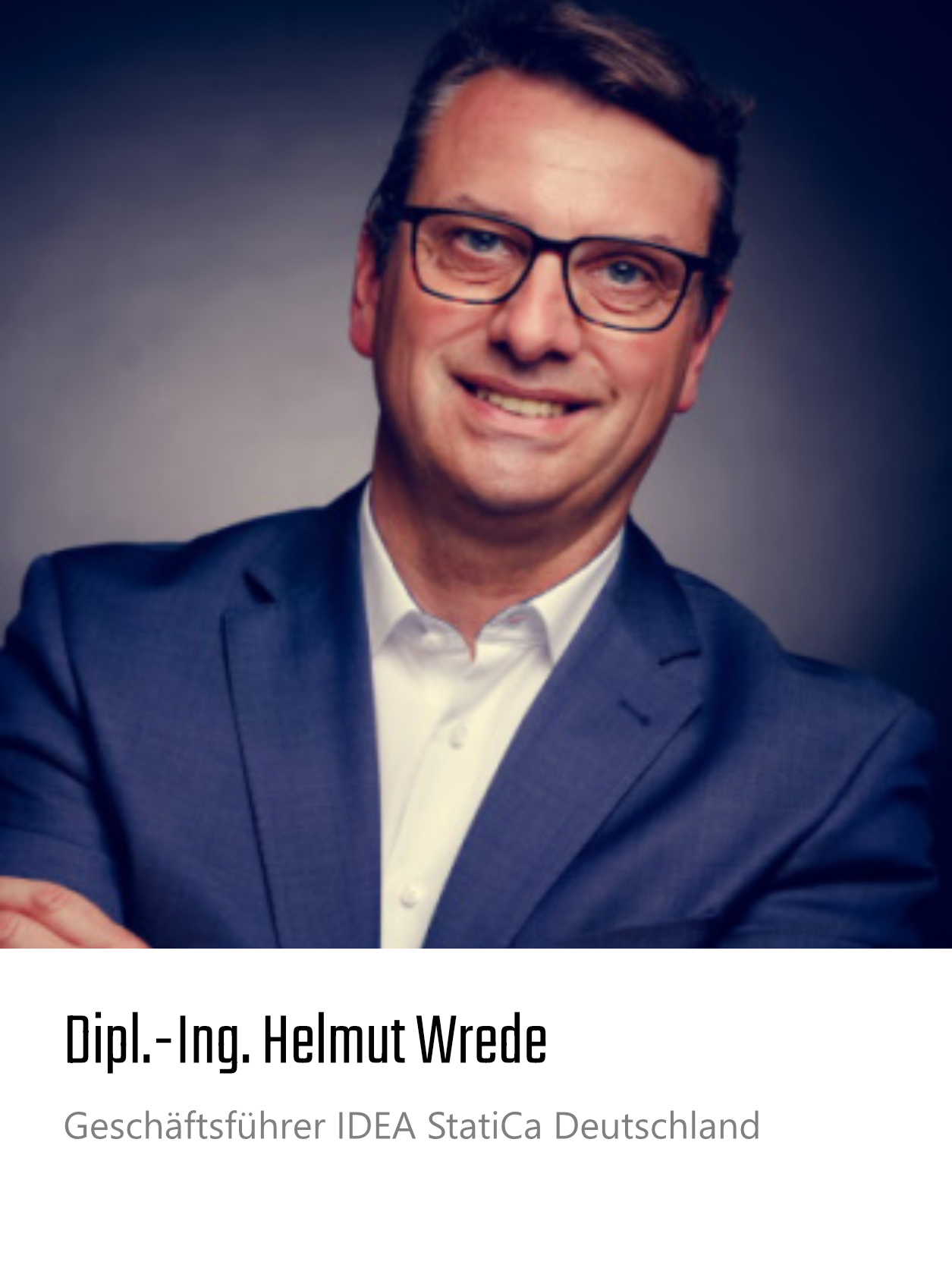 | 11:00 - 11:15 Uhr | Begrüßung und Vorstellung des Programms Dipl.-Ing. Helmut Wrede, Geschäftsführer IDEA StatiCa Deutschland GmbH Kurze Einführung und Überblick über das Tagesprogramm. |
