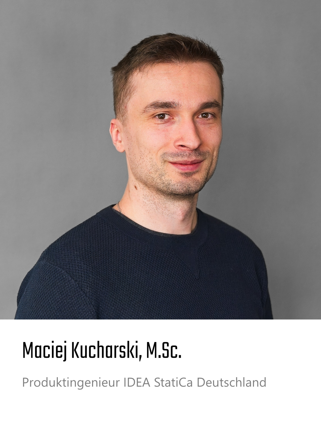 | 15:10 - 15:30 Uhr | Ist die Fußplatte ausreichend steif? – Verankerungen effizient modellieren und nachweisen Maciej Kucharski, M.Sc., Produktingenieur IDEA StatiCa Im Mittelpunkt dieses Vortrags steht die Steifigkeit von Fußplatten bei Stahl-Beton-Verankerungen. IDEA StatiCa unterstützt die Modellierung und den Nachweis dieser Bauteile mit Hilfe der CBFEM)*. Gezeigt werden Beispiele aus der Ingenieurpraxis. |