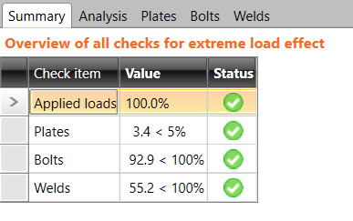 Abgesehen von reinen Analyseergebnissen bietet IDEA StatiCa Connection natürlich die gesamten EN/AISC-Nachweise für alle Elemente, wie in den nächsten beiden Bildern gezeigt, und liefert uns sehr klare Pass/Fail-Ergebnisse.