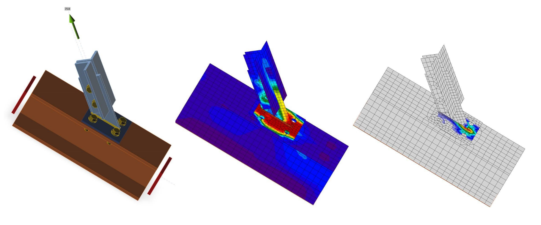 Die Gesamtanordnung der Verbindung mit Schrauben und Schweißnähten mit 75 kN Bemessungsaxiallast an den Streben, die Vergleichsspannungskurven zeigen die Bereiche hochbelasteter Bauteile und einen Hinweis auf entwickelte plastische Dehnungen an der Grundplatte.