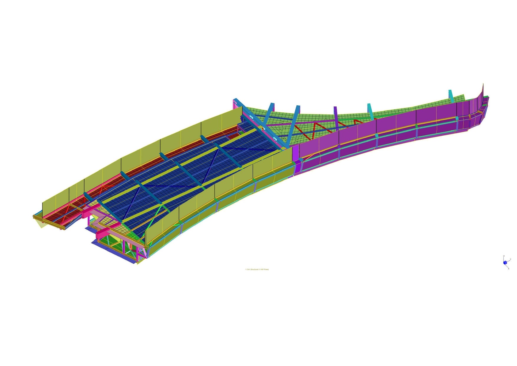 Während des Projekts erforderte das Profil der Terrasse besondere Aufmerksamkeit. Zuvor hatte es im Profil die Form eines Bootsrumpfes. Durch die Einführung einer Kröpfung sowohl an der Oberseite als auch an der Unterseite waren sehr komplizierte Stahlverbindungen erforderlich, bei denen der sekundäre Träger durch die primäre Fachwerklinie gekröpft wird.