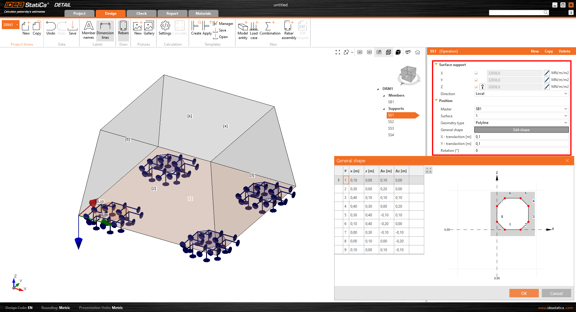 The advantage of surface support is the possibility of defining stiffness and setting non-linear behavior that simulates contact with the soil. Supports defined by general shape (polyline) can be used to simulate piles.