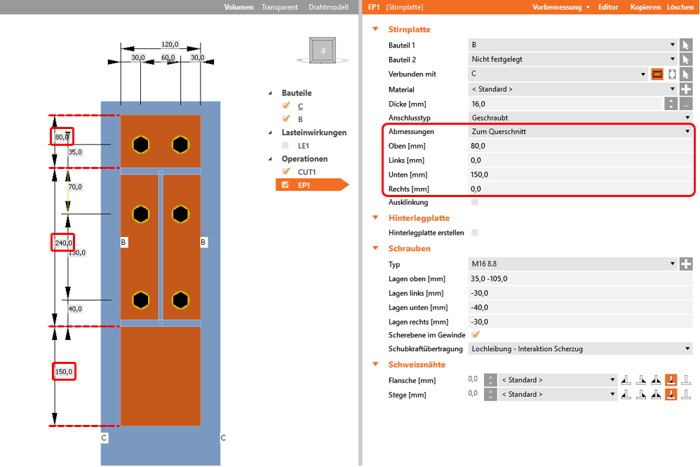 Die Einstellung "Abmessungen" legt fest, mit welchem Bezug die Abmessungen gewählt werden. Zum Querschnitt definiert die rechteckige Form der Stirnplatte durch die Höhe und die Breite des Querschnitt des anzuschließenden Bauteils (Bauteil 1).