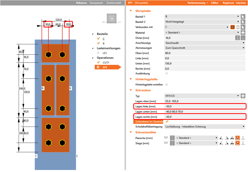 Die Positionierung der Schrauben in die einzelnen Richtungen (oben/unten/links/rechts) erfolgt durch die Verschiebung vom Nullpunkt, der sich aus den Schnittpunkten der o.g. Grenzflächen des Querschnitts ergibt.