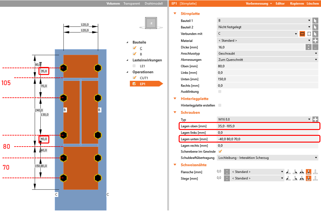 Der Bemaßungspfeil für die Höhe bezieht die Abstände ein und markiert die Gesamthöhe der Stirnplatte.